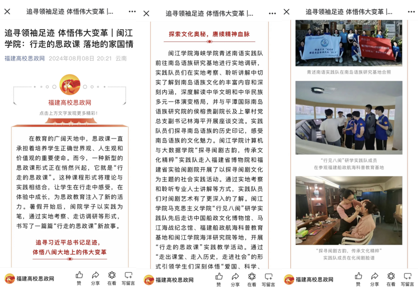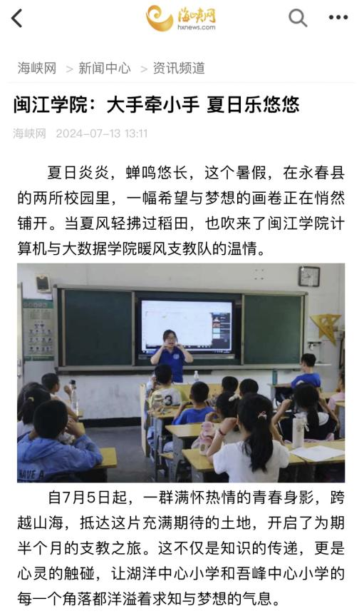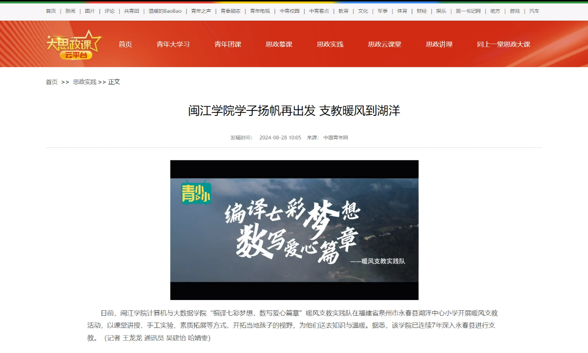 本次暑期社会实践,av在线 各实践团队脚踏实地、圆满完成实践活动并形成优异的实践成果。同时av在线 师生积极开展实践宣传,多个实践队相关实践纪实得到中新网、中国周刊网、新福建、中国日报网、海峡网、中国青年网等各类媒体的关注、报道,其中国家级报道13篇,省级媒体报道5篇,其他级别媒体报道90余篇,起到了良好的宣传推广效果,展现了计数学院学子的风采,也提高了av在线 的社会影响力和美誉度。可喜可贺的是,“编译七彩梦想,数写爱心篇章”暖风支教实践团队的支教视频被共青团中央大思政课云平台《思政实践》专栏所收录。此殊荣非但彰显了对暖风支教队伍的深切认可与崇高赞誉,更如同璀璨星辰,照亮了团队每位成员不懈耕耘、默默奉献的成长轨迹,成为其辛勤汗水最为闪耀的徽章,彰显着责任与担当的熠熠光辉。