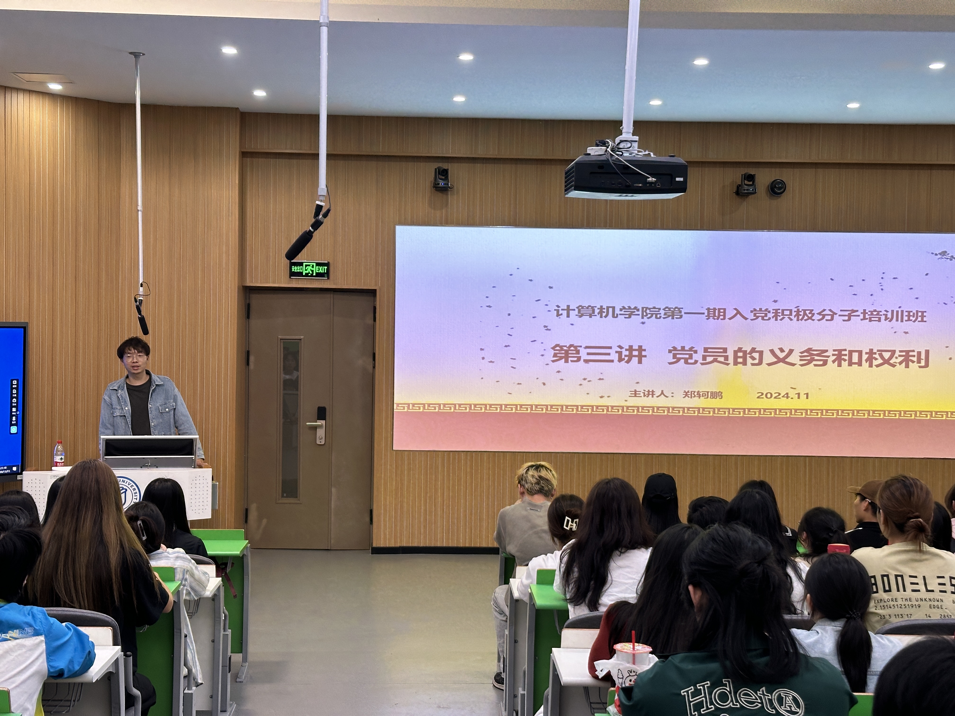 计算机学院学生第三党支部书记陈之标以《端正入党动机,明确入党流程》为题,就入党的基本条件及党员发展流程进行了详细的讲解,帮助同学们更加清晰地了解入党流程,进一步深刻领悟端正入党动机的重要性。通过讲述入党誓词的演变过程,生动介绍了中国共产党的发展历程。陈之标指出,作为一名入党积极分子,应该深刻认识到,理解并践行党的宗旨与性质是向党组织靠拢的必经之路,全体学员要以党的宗旨为指引,不断端正入党动机,努力成为有理想、有本领、有担当的时代新人。