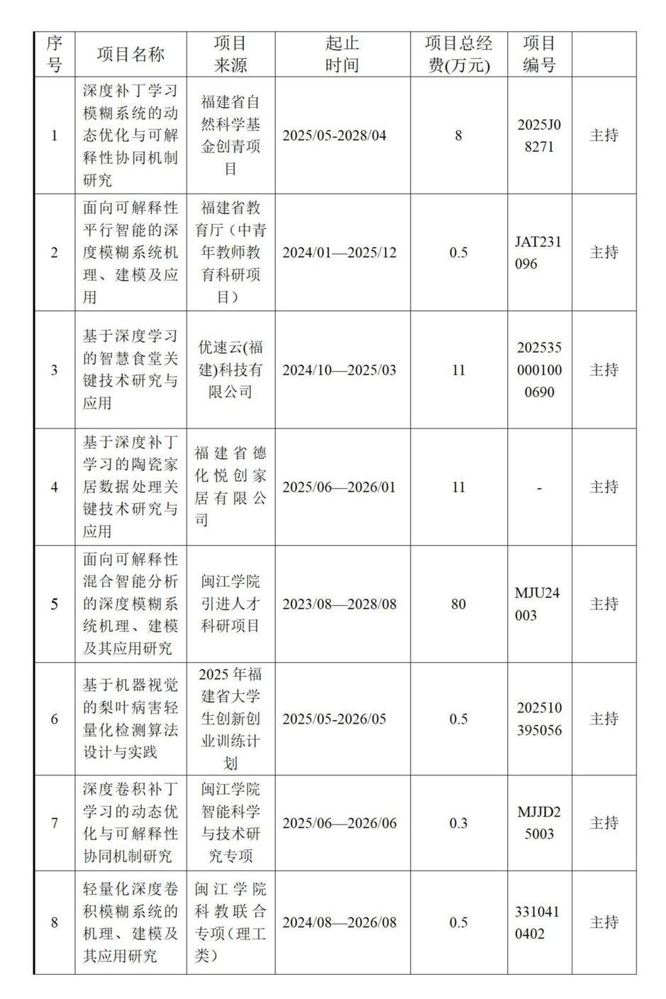 科研成果: 论文 [1] Y. Huang(黄允浒), D. Chen*, W. Zhao, Y. Lv, S. Wang. Deep patch learning algorithms with high interpretability for regression problems[J], International Journal of Intelligent Systems, 2022, 37(11):8239-8276. (SCI 收录,中科院一区, JCR 1区,Top期刊, IF:8.993) [2] Y. Huang(黄允浒), D. Chen*, W. Zhao, Y. Lv. Fuzzy c-means clustering based deep patch learning with improved interpretability for classification problems[J], IEEE Access, 2022, 10: 49873-49891. (SCI 收录, 中科院三区, IF:3.367) [3] Y. Huang(黄允浒), D. Chen*, W. Zhao, H. Mo. Deep fuzzy system algorithms based on deep learning and input sharing for regression application[J], International Journal of Fuzzy Systems, 2021, 23(3): 727-742. (SCI 收录,中科院二区, IF:4.673) [4] Y. Huang(黄允浒), G. Lin*, D. Chen*, W. Zhao. Deep neural-fuzzy system algorithms with improved interpretability for classification problems[J], International Journal of Fuzzy Systems, 2024, 26, 900–921.(SCI 收录, 中科院三区,IF:4.673) [5] Y. Huang(黄允浒), G. Lin*, D. Chen*, W. Zhao, M. Fu. Optimize deep neural fuzzy system algorithms for regression problems[J], International Journal of Fuzzy Systems, 2025. //doi.org/10.1007/s40815-025-01998-y [6] Huang Y(黄允浒), Lai W, Chen D*, Lin G,* Yin J.* Enhanced intelligent train operation algorithms for metro train based on expert system and deep reinforcement learning. PLoS One, 2025, 20(5): e0323478. //doi.org/10.1371/journal.pone.0323478(SCI 收录, 中科院三区,JCR 1区IF:2.9) 软件著作权 (1)av在线 ; 基于神经模糊系统算法的分类软件V1.0, 2024SR0640462, 原始取得, 全部权利, 2024-05-08 (软件著作权) (2)黄允浒; 陈德旺; 赵文迪; 基于深度学习的深度模糊系统回归预测软件V1.0, 2021SR1279715, 原始取得, 全部权利, 2021-10-18 (软件著作权) (3) 赵文迪; 陈德旺; 黄允浒; 基于ANFIS的深度神经模糊系统回归预测应用软件V1.0, 2021SR0978053, 原始取得, 全部权利, 2021-6-15 (软件著作权) (4) 童文林; 陈德旺; 黄允浒; 基于模拟退火与规则约简的模糊系统回归预测软件V1.0, 2020SR1619713, 原始取得, 全部权利, 2020-10 (软件著作权) (5) 蔡际杰; 陈德旺; 黄允浒; 基于粒子群优化的模糊系统自学习算法回归软件V1.0, 2020SR1619706, 原始取得, 全部权利, 2020-10-3 (软件著作权) | |||