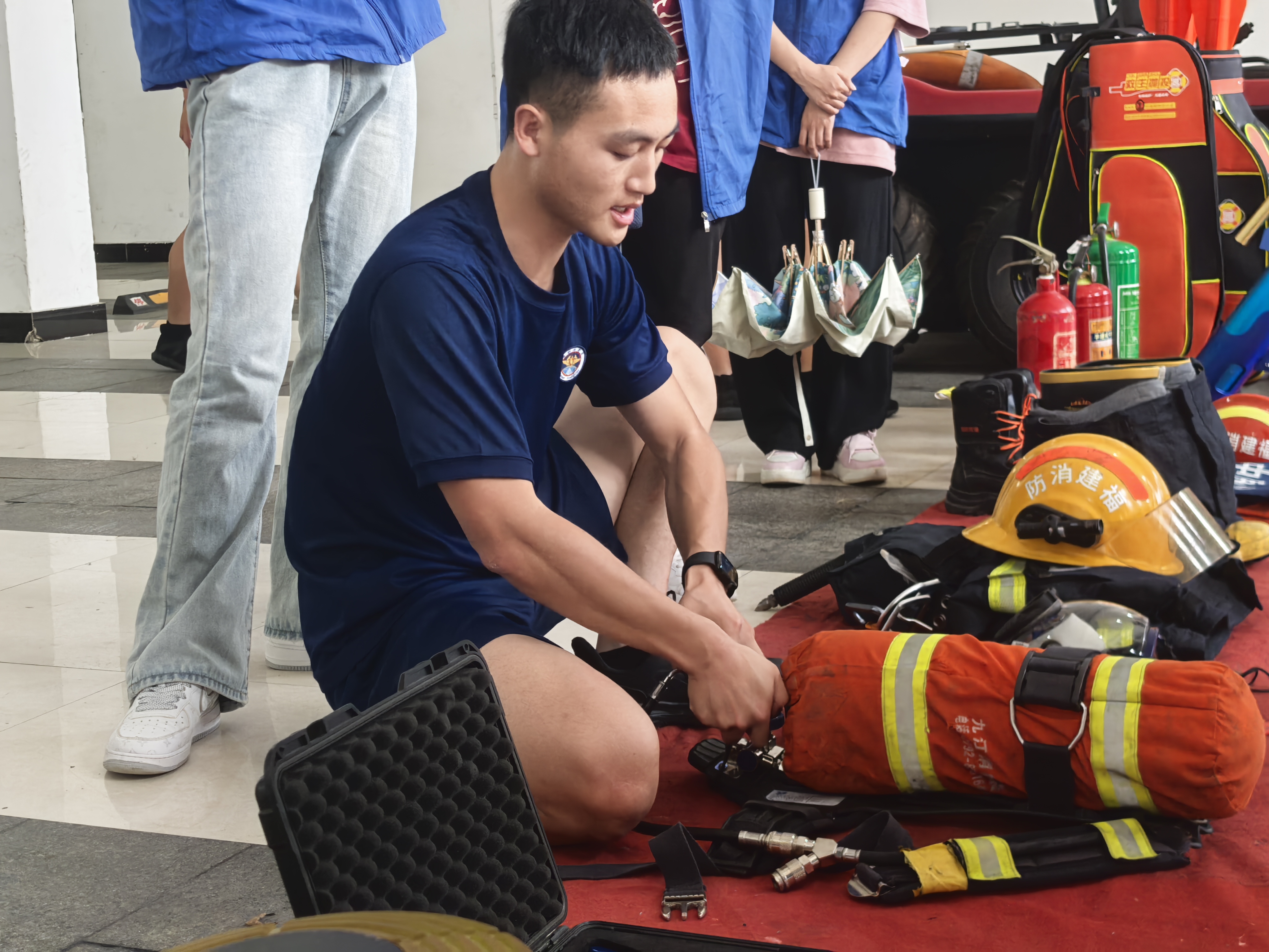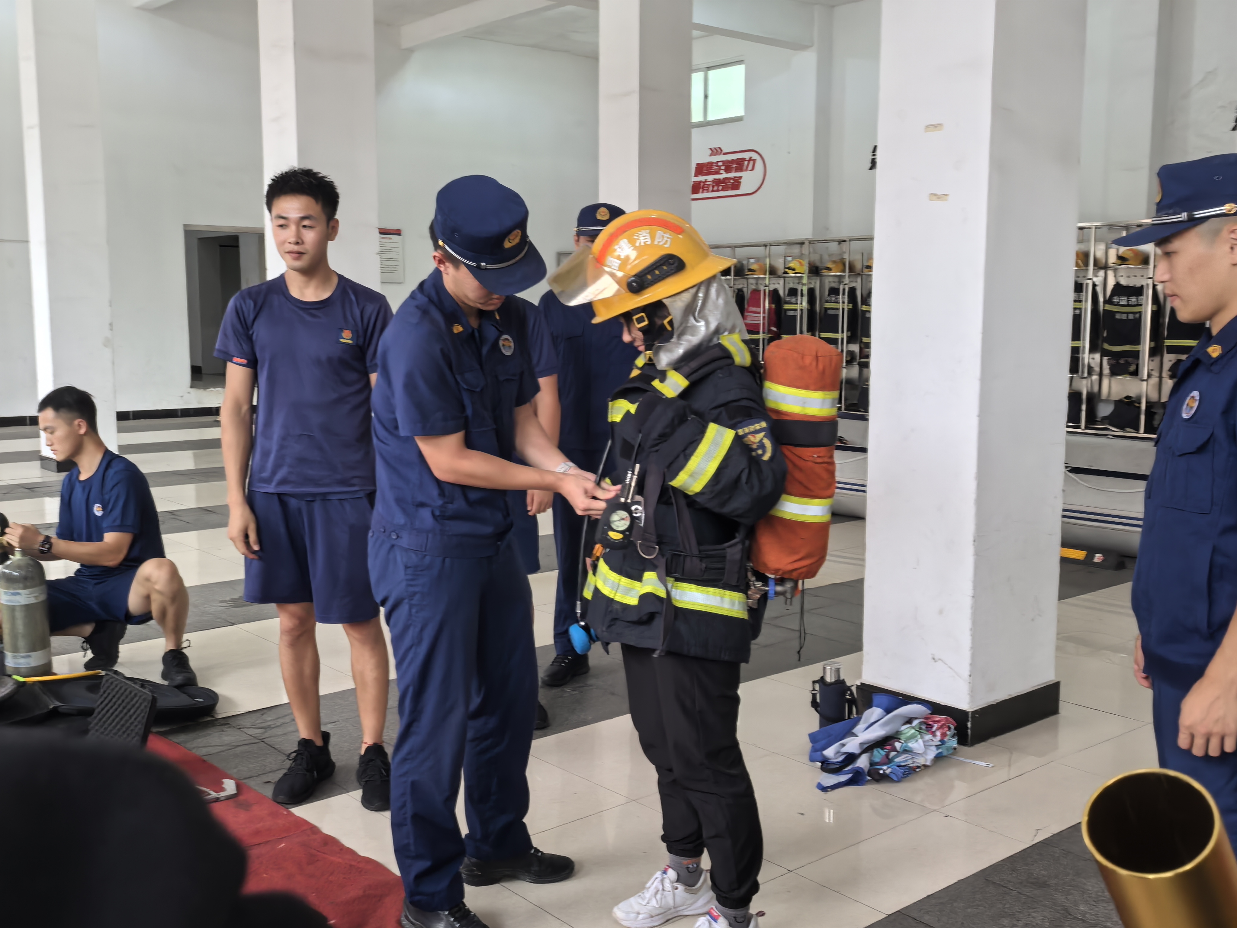 在装备体验环节,消防员协助志愿者穿戴灭火防护服,耐心调整扣带松紧,讲解穿戴规范,并说明整套装备在高温火场中防护与负重作业的双重功能,防火服厚重的材质与沉重的装备,让志愿者切身感受消防救援工作的严谨性与不易。