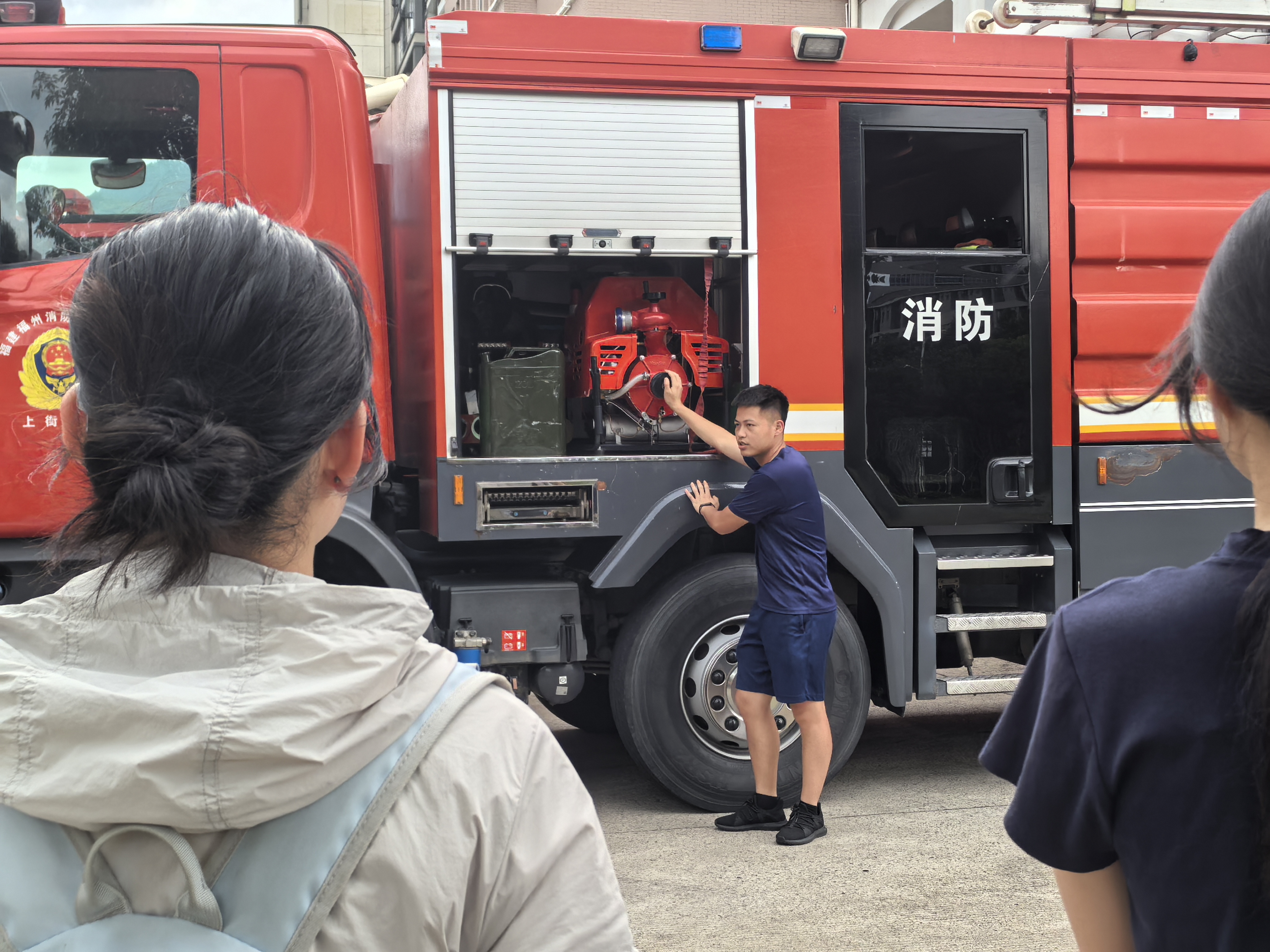 消防员先围绕各类火灾场景展开,对应讲解云梯消防车、水罐/泡沫消防车、后援消防车等不同类型消防车,向同学们清晰阐释每种车在救援中承担的具体功能。