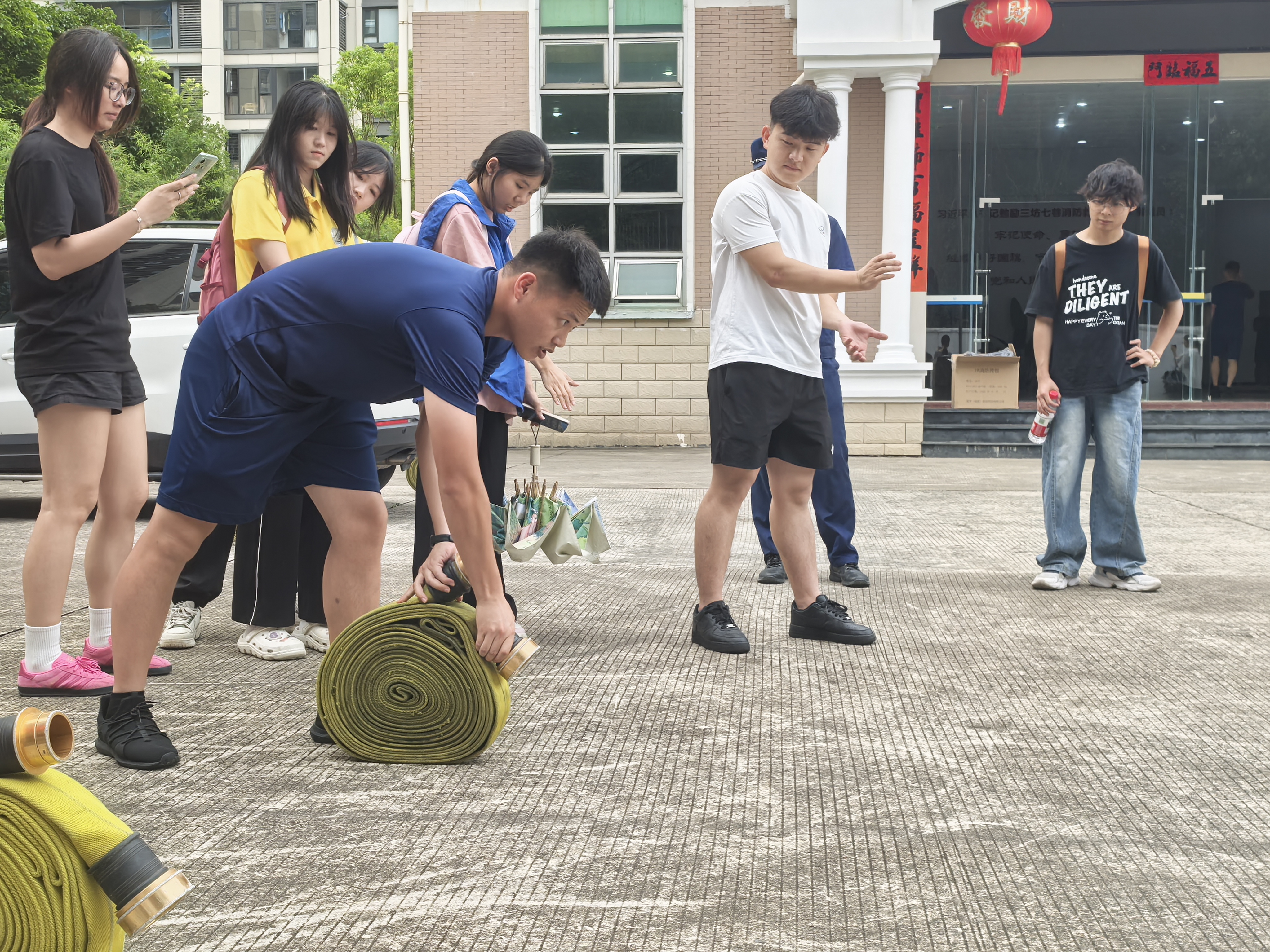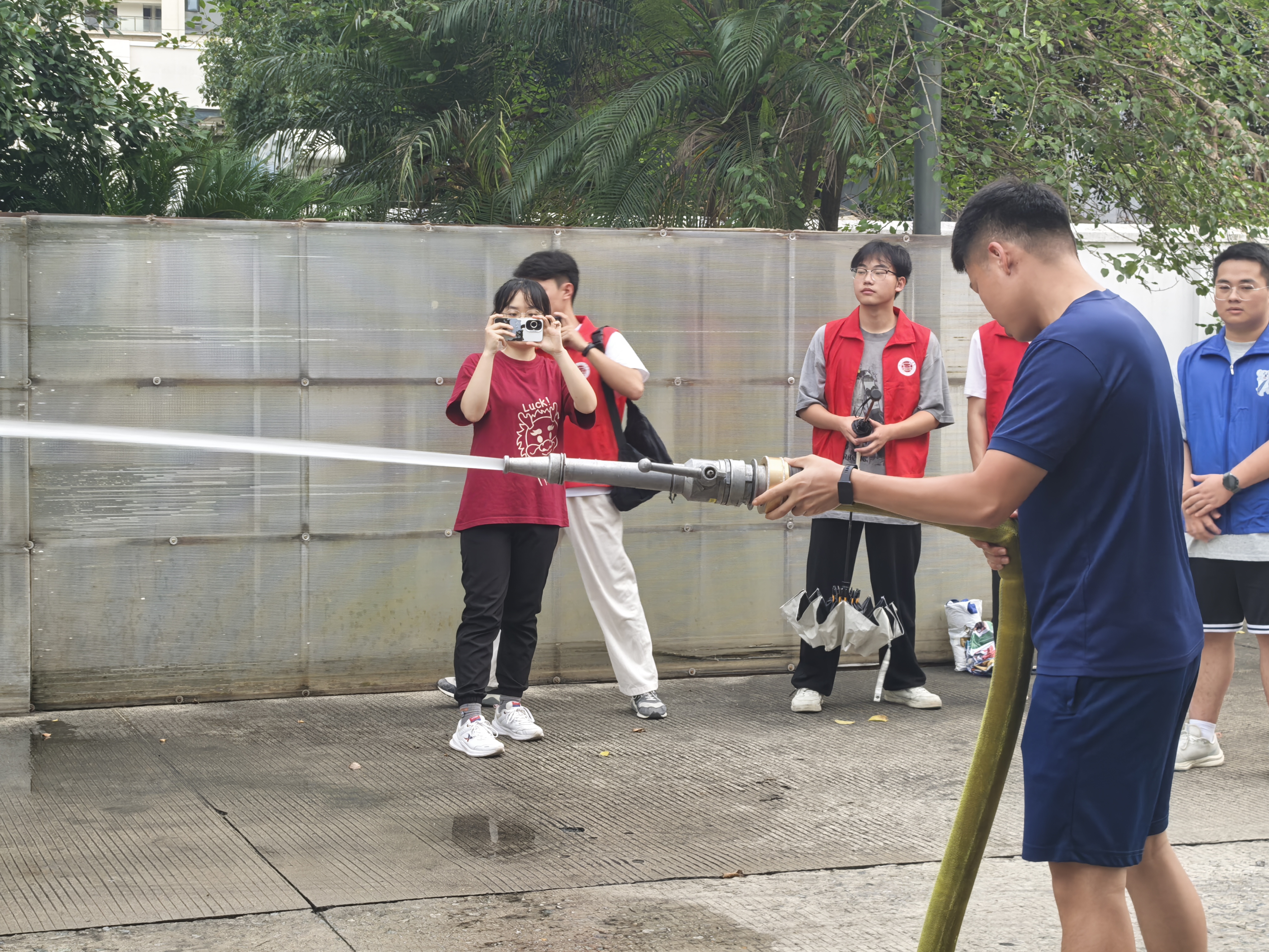 接着就是最受同学们期待的环节——消防水枪实操。同学们在消防员指导下体验操作,高压水流的强劲后坐力让大家真切感受到灭火救援的难度,也对消防员的专业素养有了深刻认识。