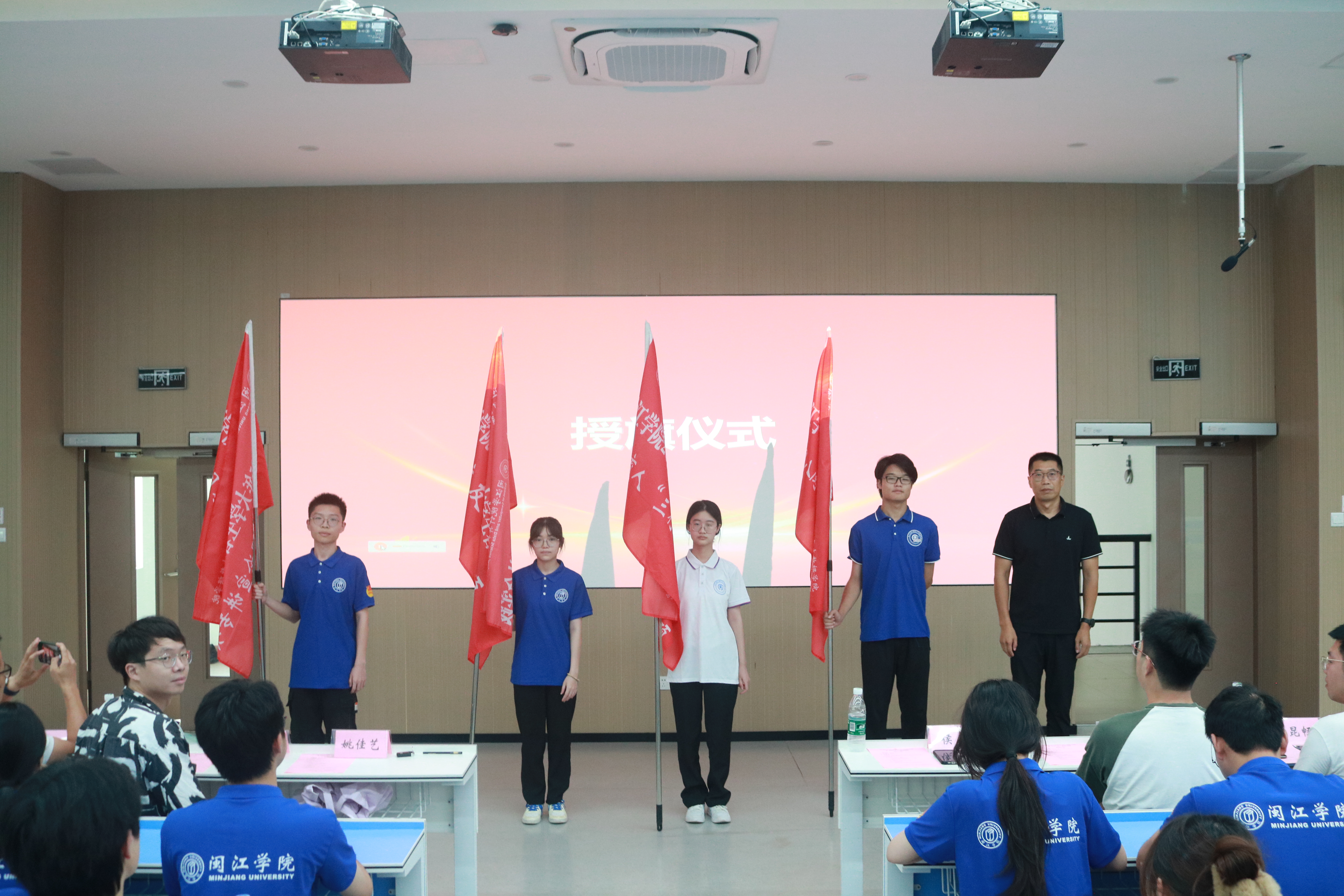 授旗环节,侯杰副书记为暑期社会实践队伍代表授旗。