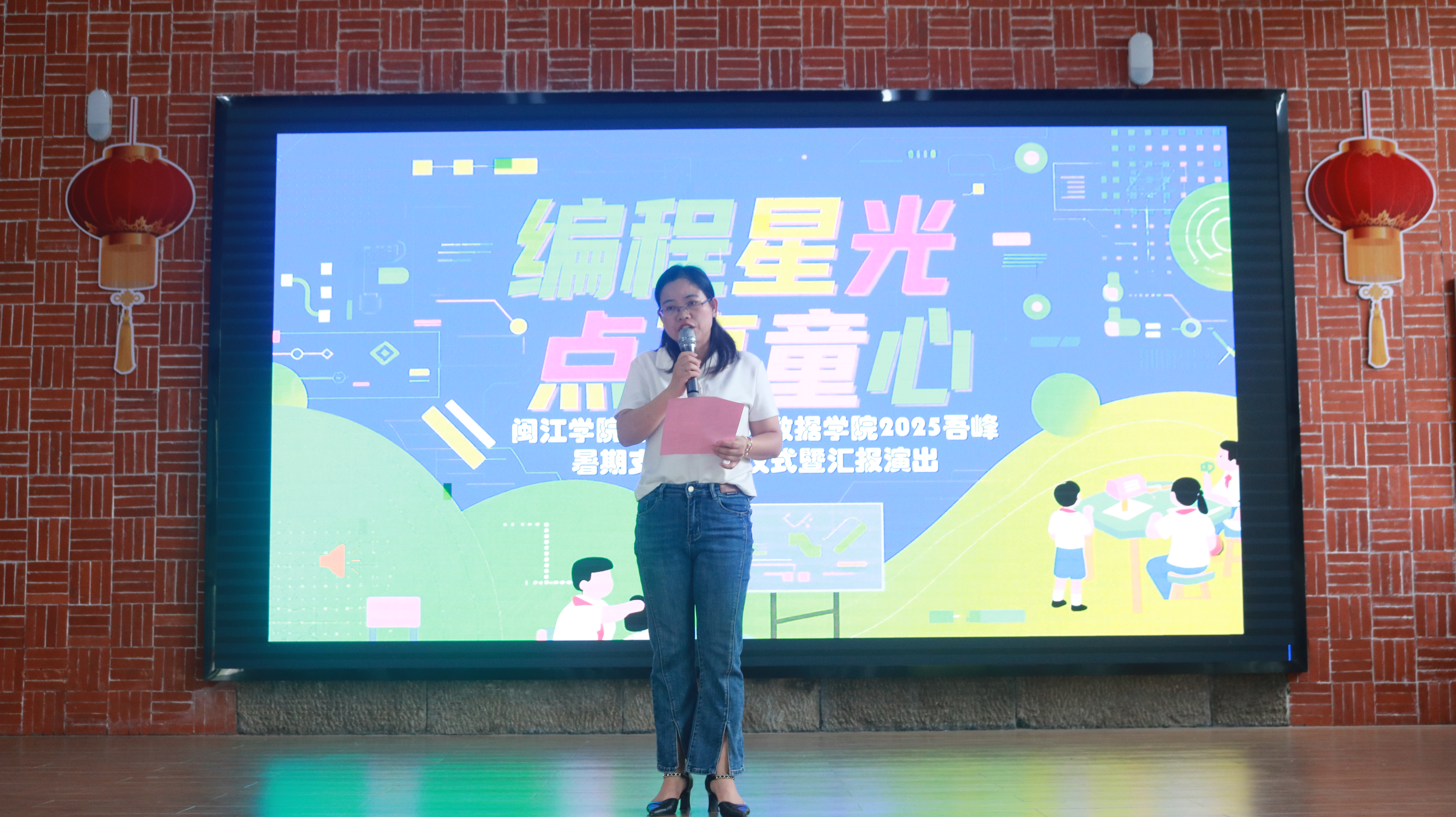 最后,全体暖风支教队员并肩走上舞台,当《我的未来式》旋律响起,他们眼中闪烁着温暖的光,歌声里满是青春的热忱与不舍。身后的大屏幕上,精心剪辑的视频缓缓流淌—— 从初遇时的羞涩微笑到课堂上的专注眼神,从课间嬉闹的欢快身影到手工课上的认真模样,每一帧都定格着夏令营的珍贵瞬间。