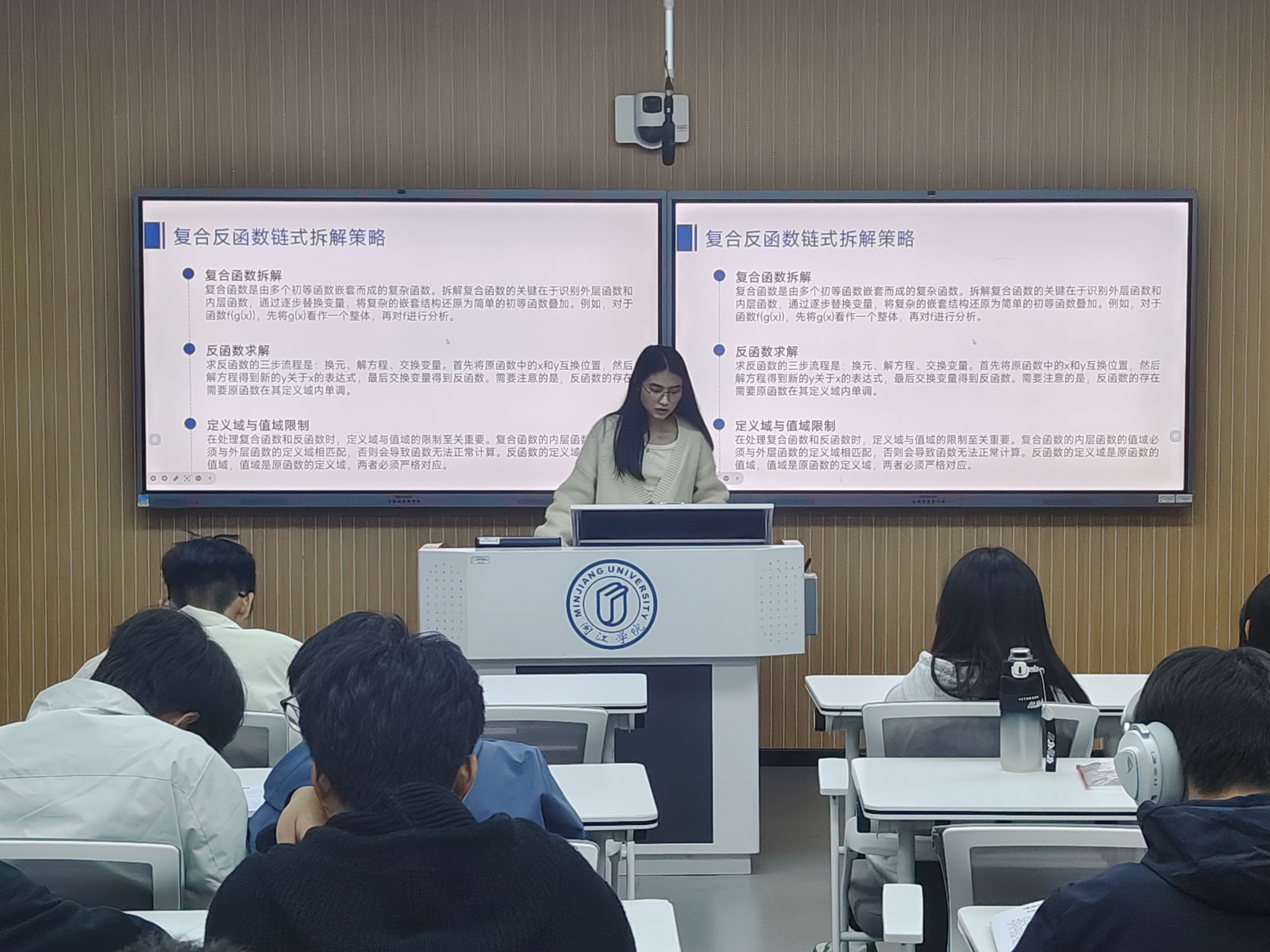 活动中,2025级人工智能2班高数助教林文希围绕前期收集的高频问题,重点讲解了“复合函数”与“函数极限”。她借助板书逐步推演典型例题,并使用不同颜色标注关键步骤,同时结合“间断点的分类”等常见误区进行辨析,帮助同学理清思路,巩固理解。