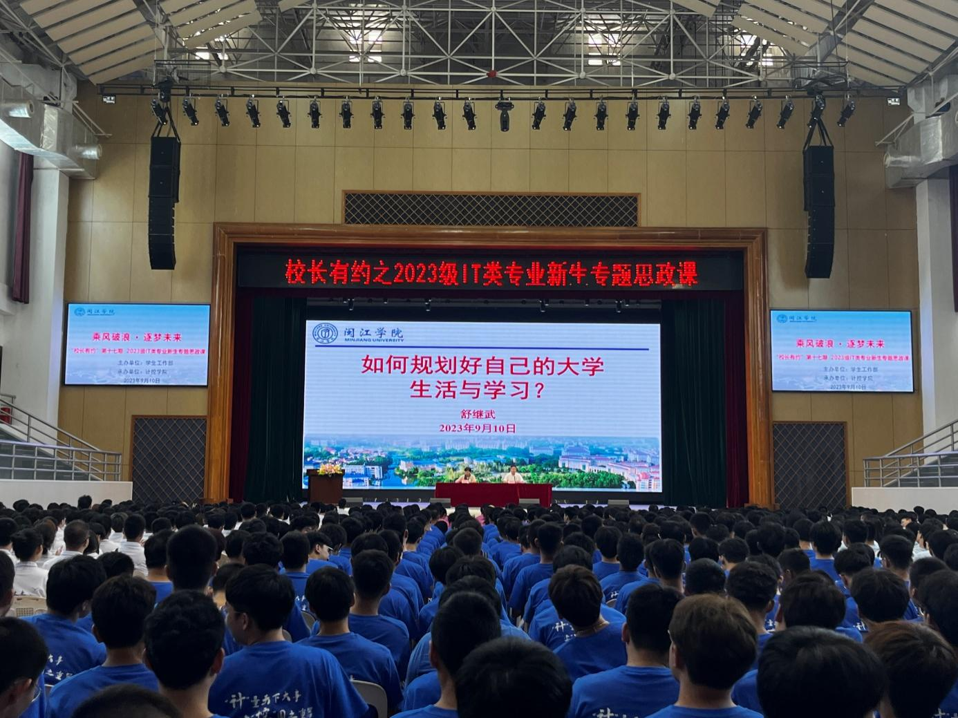 9月10日,由学工部主办、计控学院承办的“校长有约”第十七期在av在线 融侨文体中心举行。舒继武校长以“如何规划好自己的大学生活与学习”为题,为数科学院(软件学院)、物电学院、计控学院1000余名2023级IT类专业新生上了一堂生动翔实、精彩纷呈的思政课。活动由计控学院党委书记祝榕主持。