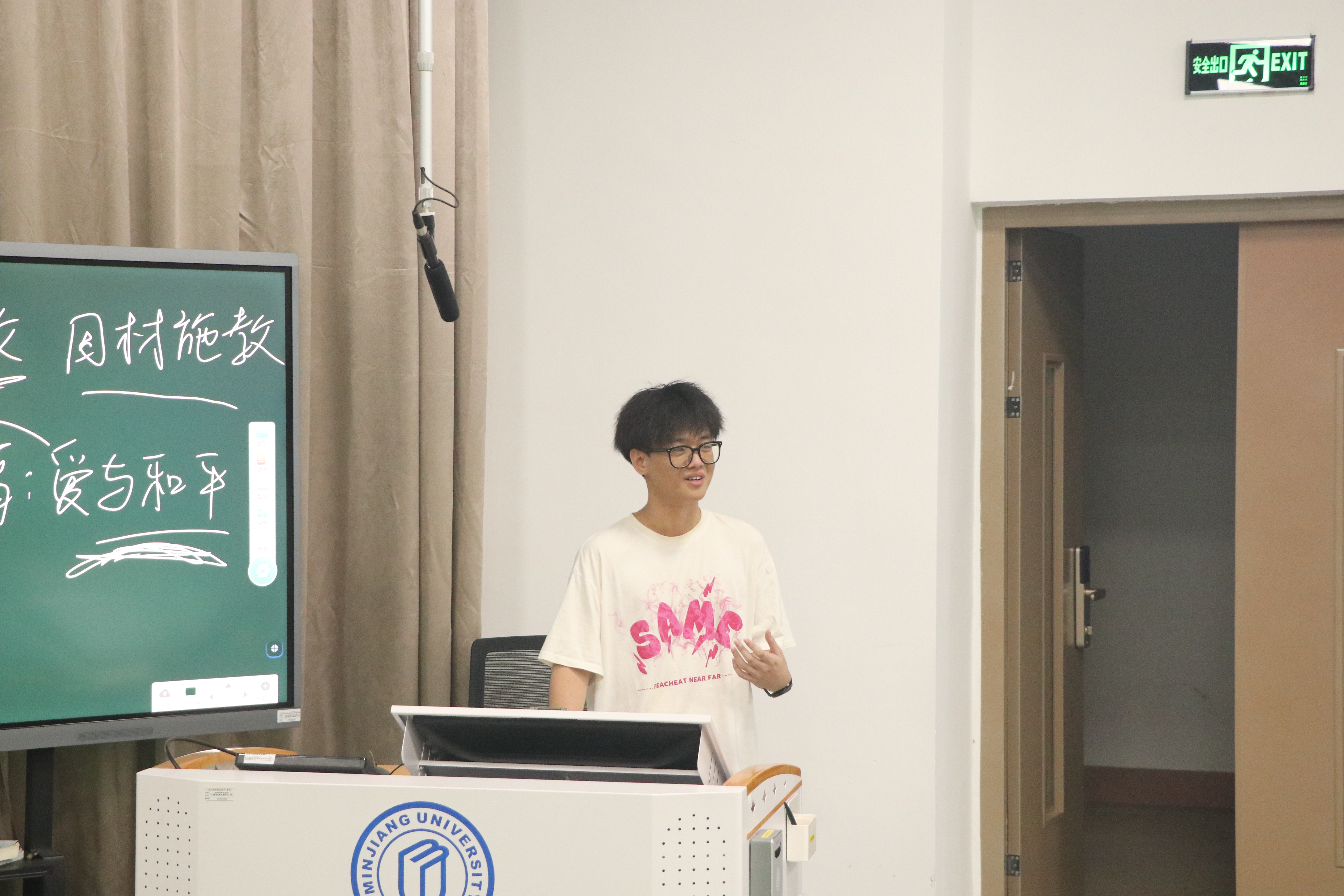 2023级数学与应用数学师范专业金奕飞同学系统地介绍了湖洋中心小学的支教课程和支教队员。课堂上,“音乐律动”、“模拟商店”、“诗词接龙”等课程让孩子们在轻松愉快的氛围中感受到了音乐、数学与语文的魅力,而“制作发电机”、“小投石机”、“牛奶动画”、“棍子跳舞”和“软件编程”等课程,则让孩子们化身小小科学家和程序员,亲手探索奇妙的科学世界。随着照片一张张地放出,孩子们纯真的笑脸也逐渐展现在我们眼前,每个孩子的故事也都深深触动了我们的内心。在艰苦的条件下,“金老师”亲手制作圆规,真心流露地说道“支教虽然苦,虽然累,但是非常值得。”最后,她感谢了学校和国家的支持,让她有机会到偏远山区中教导孩子们。她认为,教育要因材施教,要观察每个孩子的性格,走入孩子们的内心世界,从而达到育人的效果。