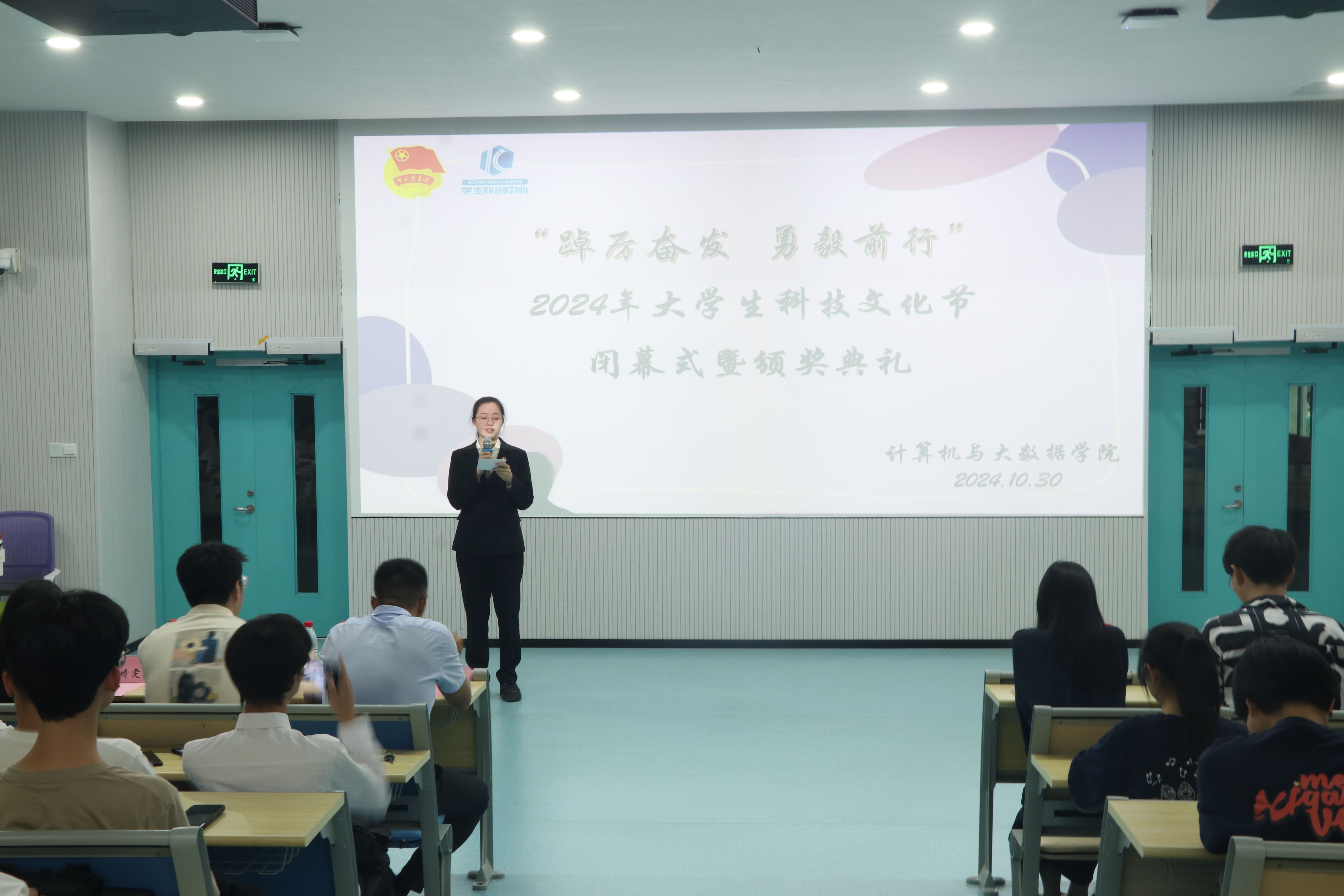 接着由学生代表甘戊铭作发言。他分享了个人在2024年科技文化节中参与天梯赛校赛和数学建模比赛的经历,强调了比赛中的挑战和选手们的表现,他认为科技文化节的活动是多样化的,这些活动不仅是展示和学习的平台,更重要的是激发了同学们对科学和技术的热情,以及对科技梦想的追求和实践。最后,他表达了将继续秉持科技创新精神,探索新知识领域,为实现科技强国梦想贡献力量的决心,并号召大家携手共进,用智慧和汗水创造辉煌。