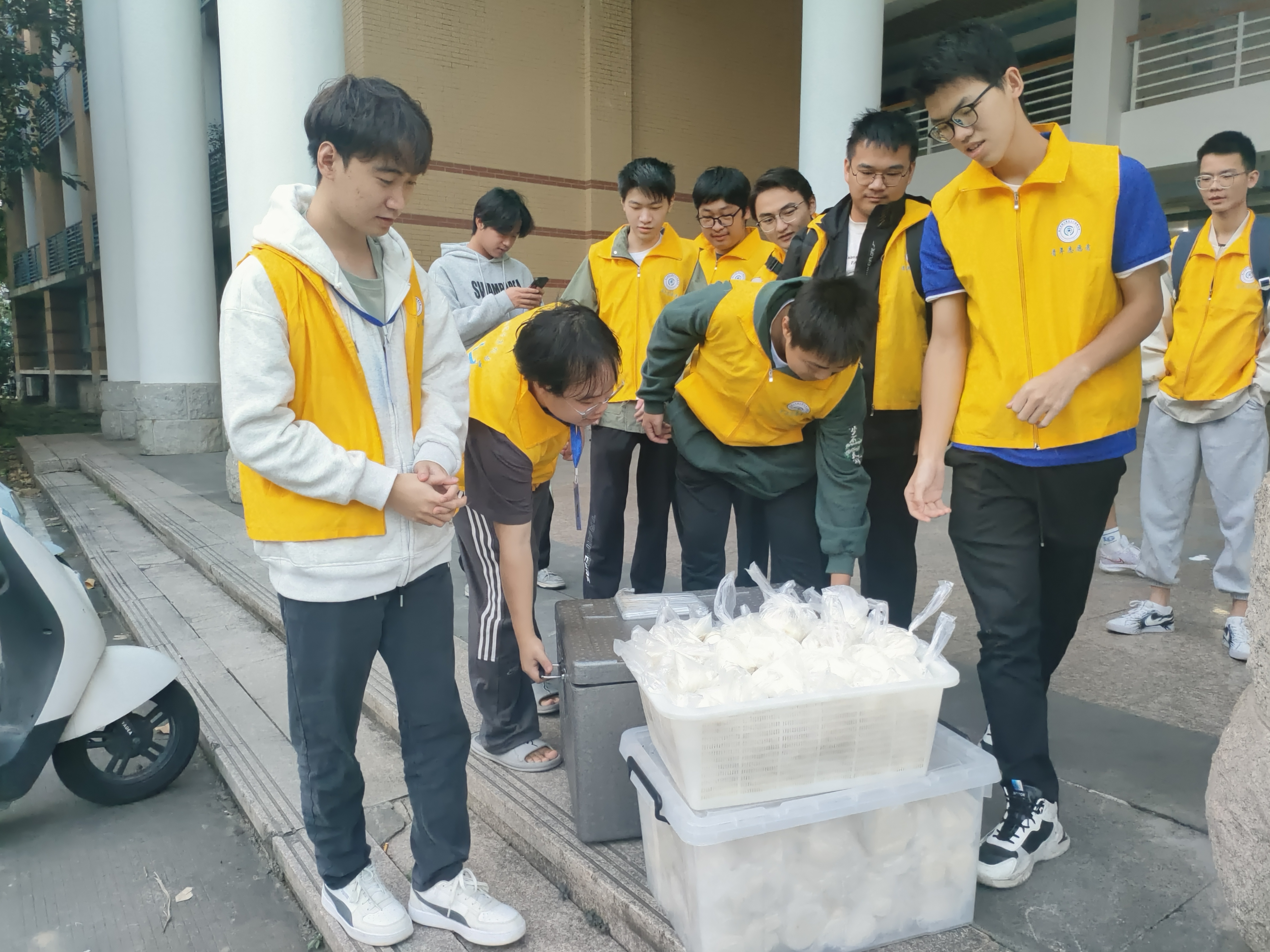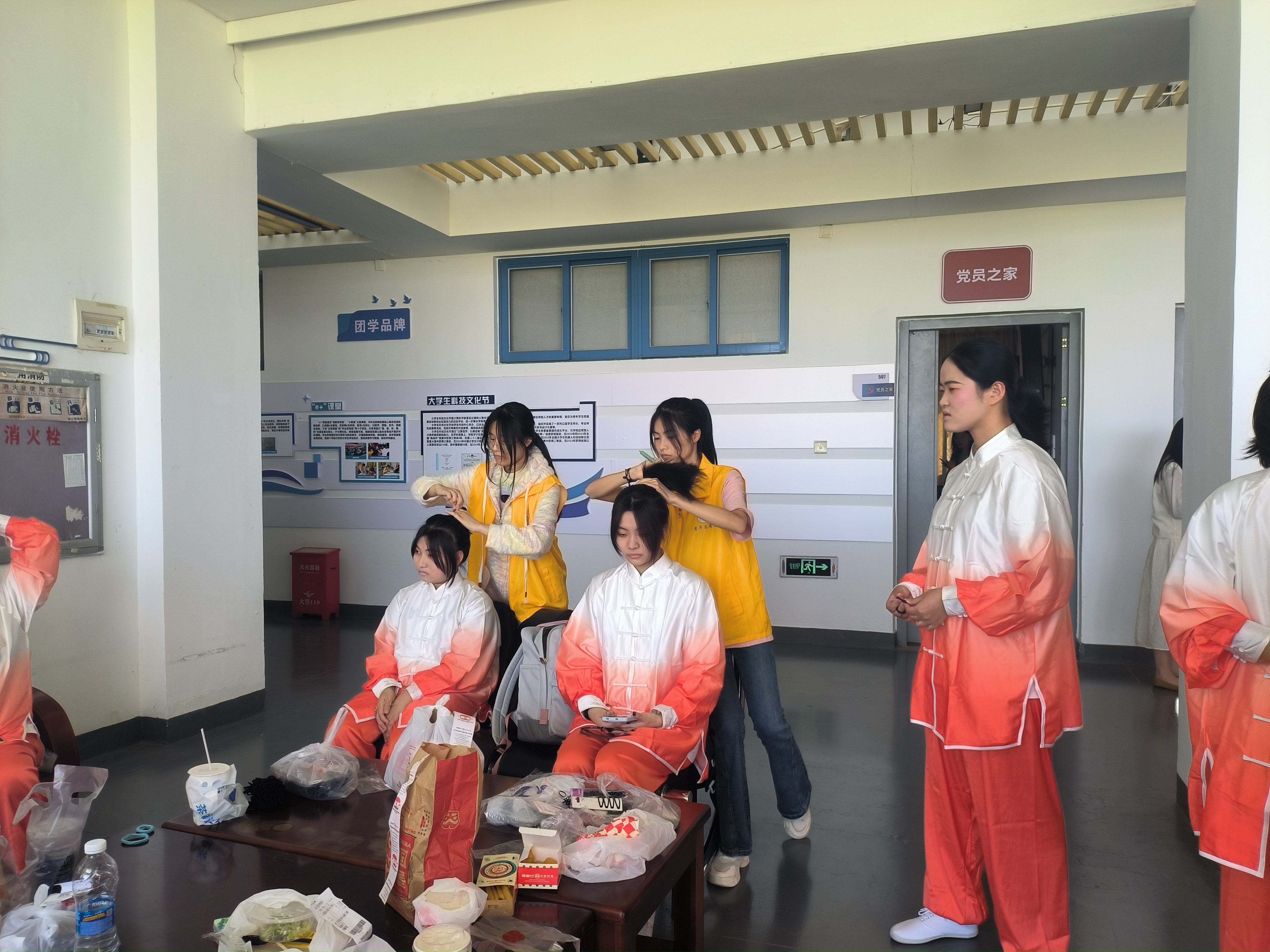 五点半的闽院天刚蒙蒙亮,志愿者们早早起身,为参加啦啦操的同学们化妆。在志愿者的巧手装扮下,妆容变得更加精致,舞姿也更加动人。与此同时,负责后勤的志愿者们也带着热乎的早餐到达,为参加啦啦操的同学们分发早餐补给。