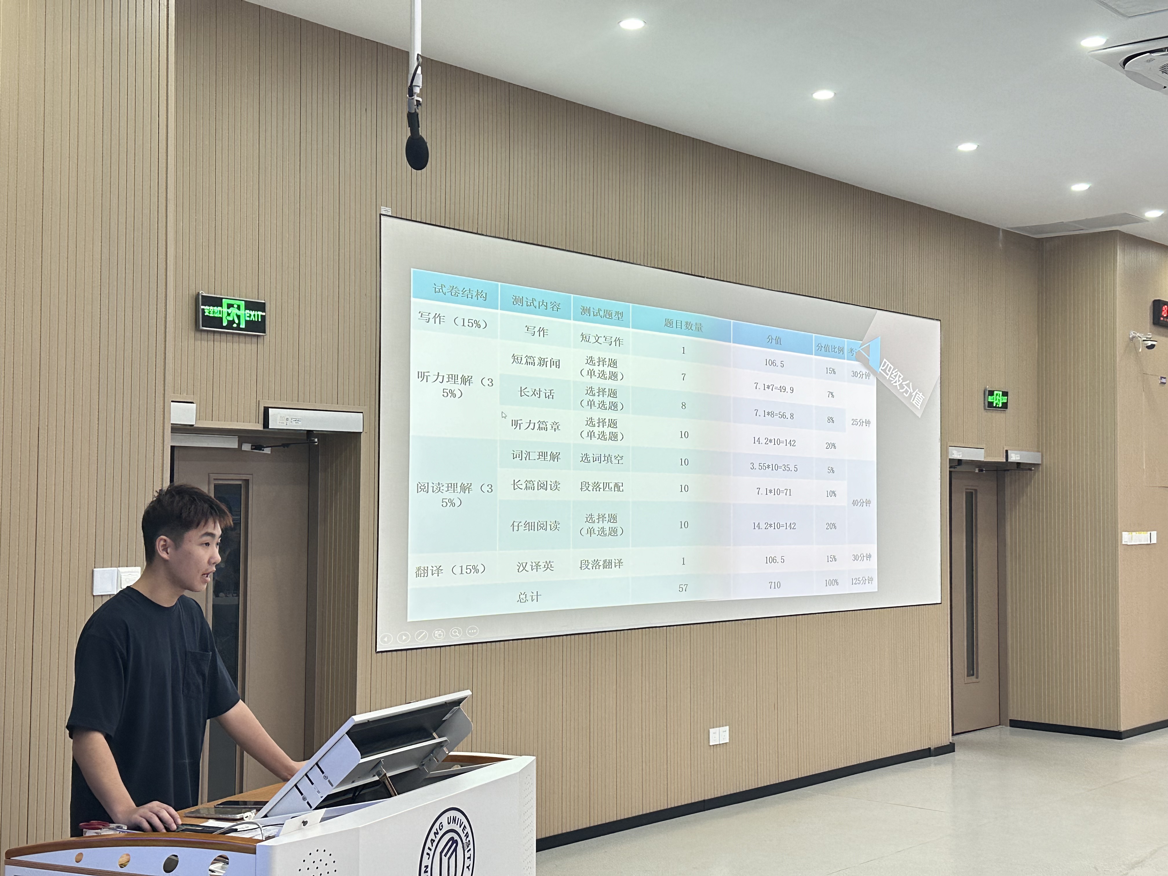在分享会过程中,林子煊同学先是为大家介绍了四六级试卷中听力、阅读、写作以及翻译的占比和分值,同时还强调了考试时间分配的重要性,避免出现未涂卡便强制收卷的情况。对此,林子煊同学还分享了他在考试前时间分配的一些经验。