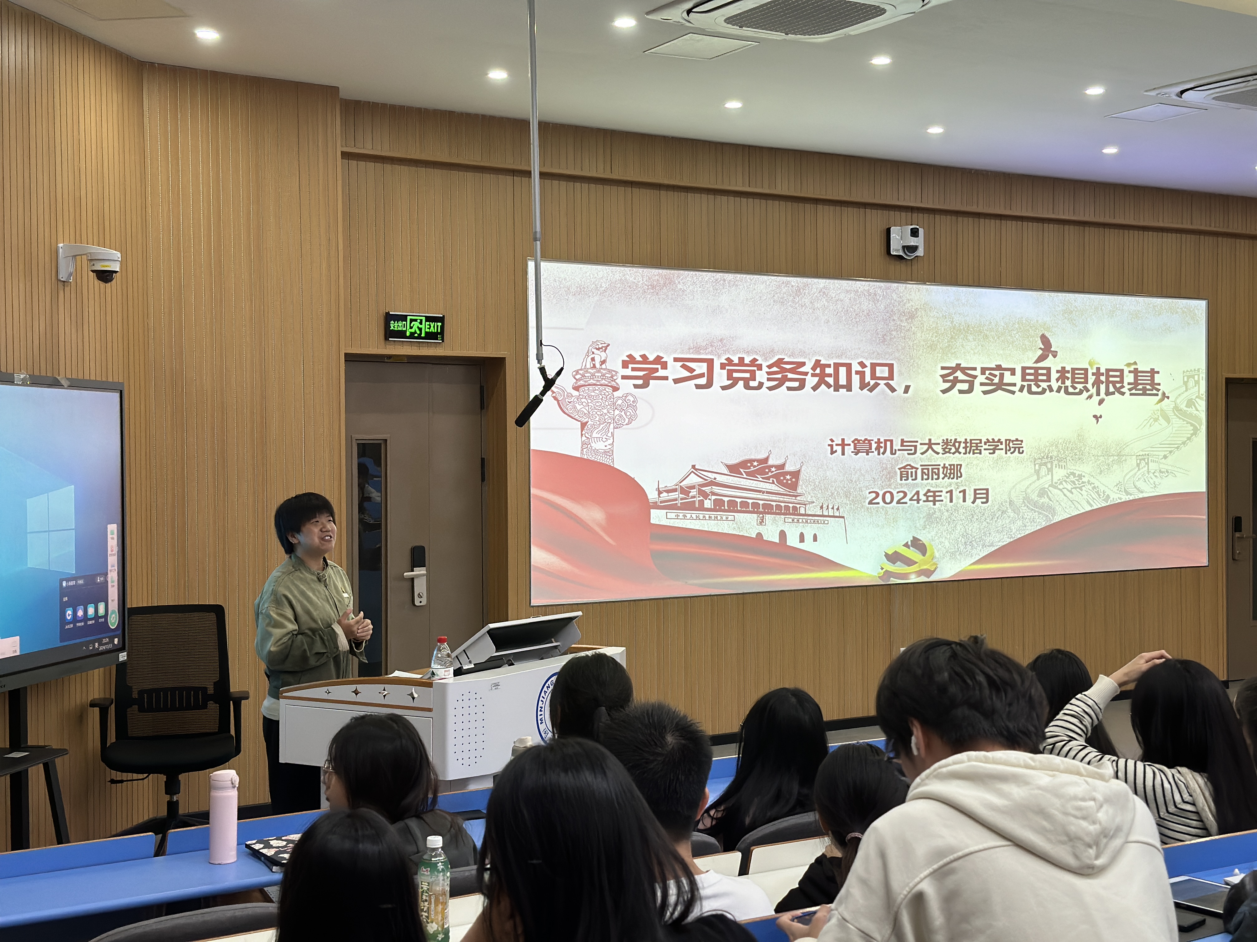 计算机学院学生第五党支部书记俞丽娜以《学习党务知识,夯实思想根基》为题,带领全体学员共同学习了习近平总书记关于党的建设的重要思想和《中国共产党支部工作条例(试行)》等。她指出,党务知识是党员必备的基本功,是指导实践、服务群众的重要理论基础,要从加深对党务知识的理解和认识中,不断增强自身的党性观念和责任意识,以更饱满的精神状态向党组织靠拢。