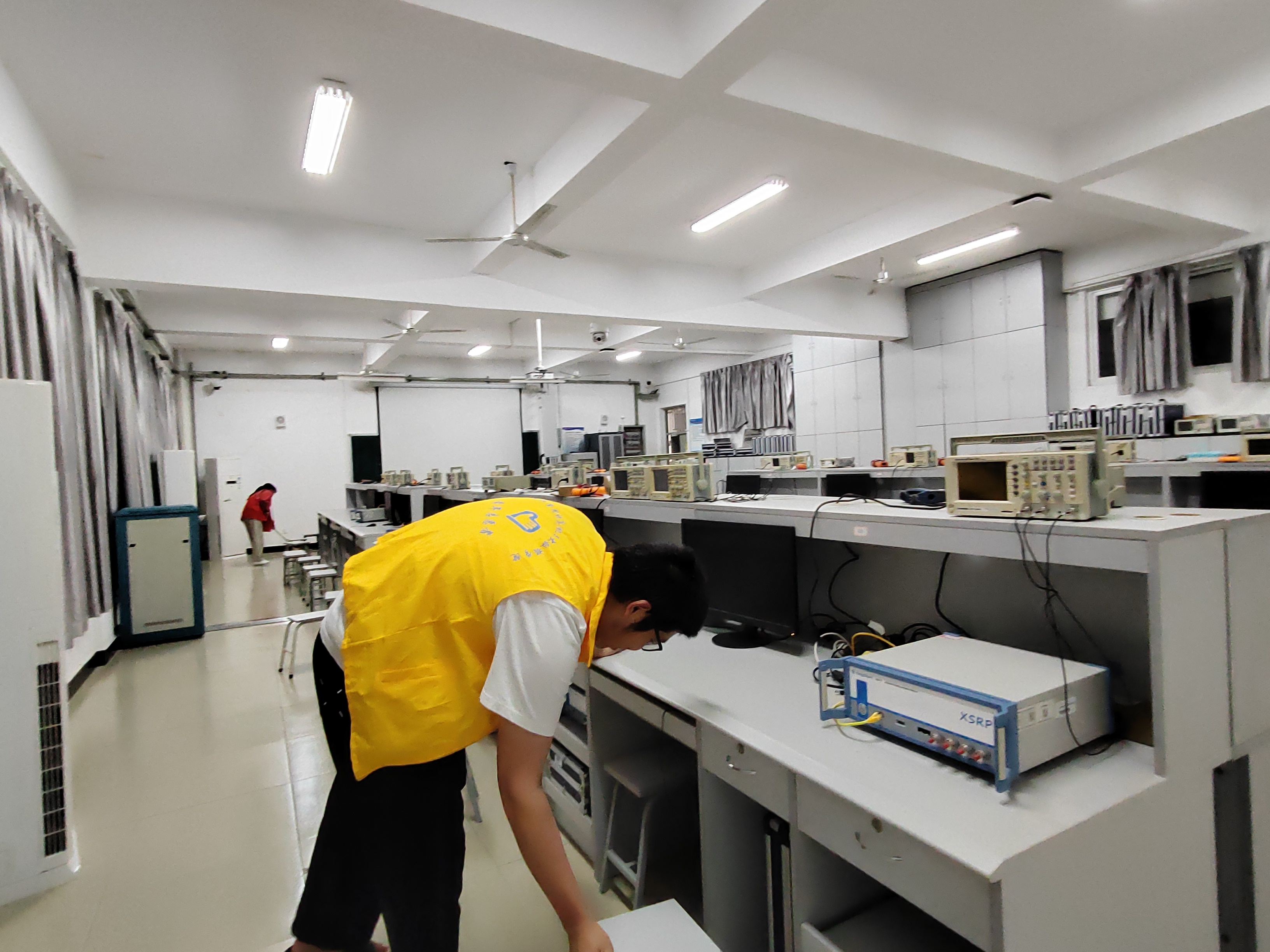 志愿者们根据负责人分配的任务,前往相应地点进行清扫。志愿者们认真地用湿抹布擦拭每张桌椅,整理书架、清扫地面,对于顽固污渍,齐心协力地反复清理,全程都展现出坚韧不拔的干劲与团结协作的精神。在工科楼A 座、B 座机房、务成楼及福万楼等地,志愿者们除清扫走廊、楼梯、教室等区域外,还协助排查并解决电脑开不了机、使用故障等问题,保障教学设备的正常运行,为学院的教学工作保驾护航。