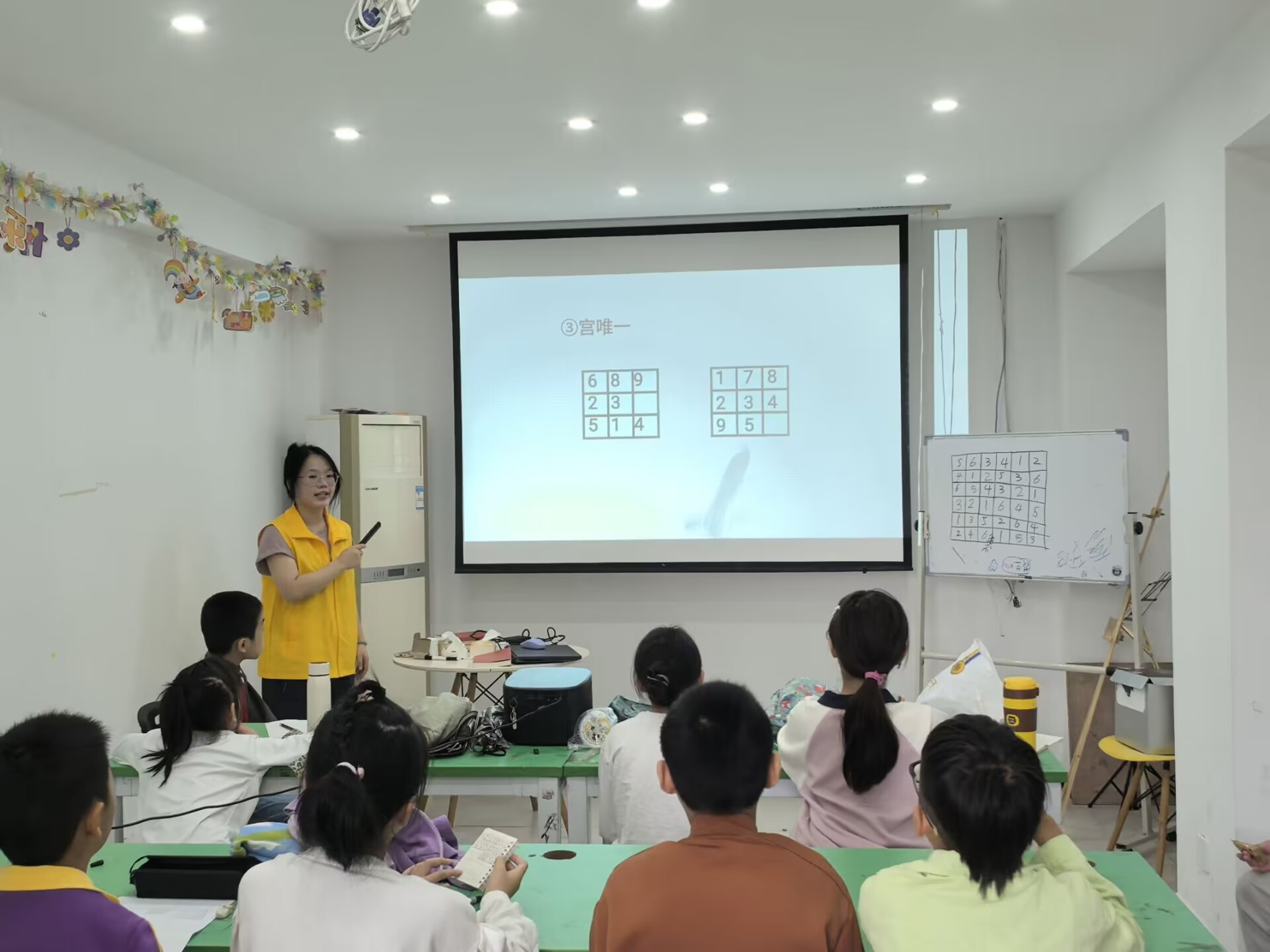 数独课程是一场数字与逻辑的盛宴。志愿者通过闯关小游戏为学生引入数独基本内容与常见的几种解法。小朋友们需要细致观察和思考,运用推理和排除法,在复杂的数字迷宫中找到唯一的答案。小朋友们通过志愿者的讲解学习数独的基本规则、解题技巧以及高级策略,轻松掌握了数独的窍门,体验到了数独带给他们的乐趣!