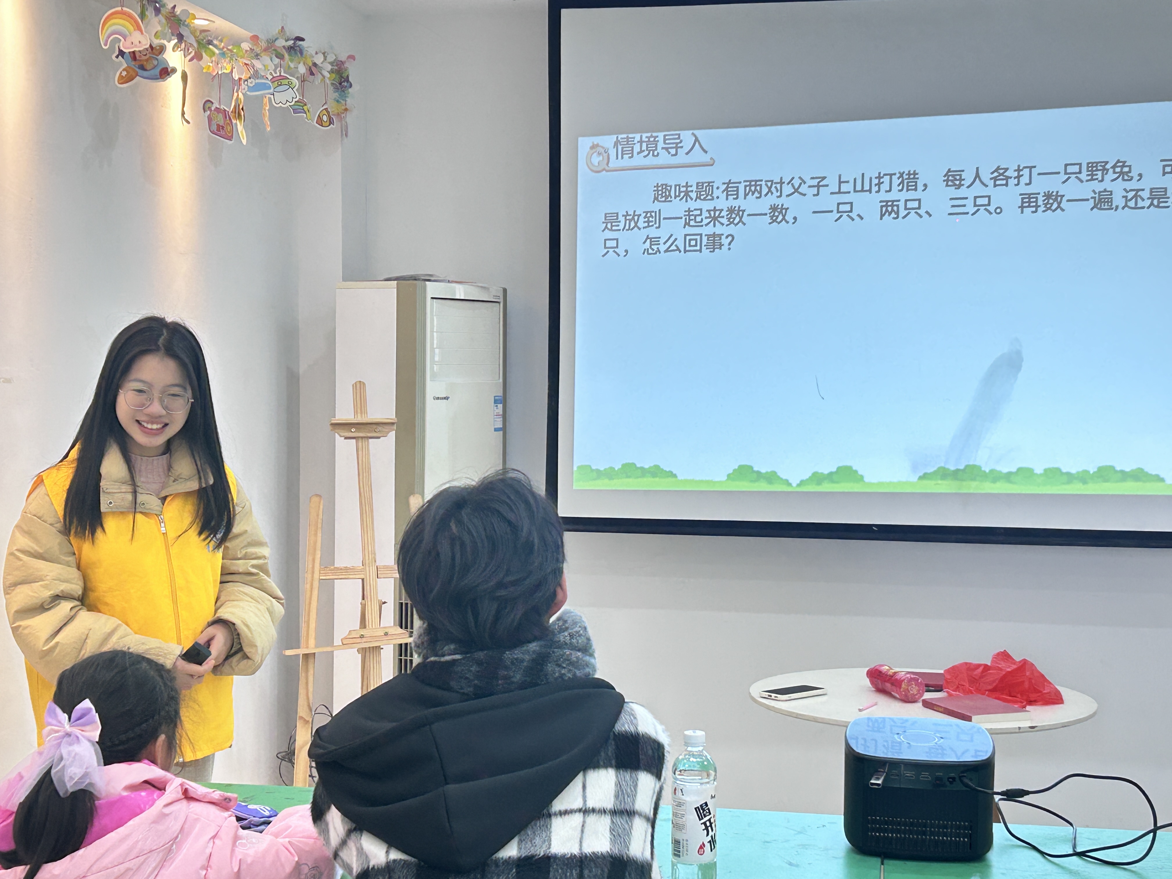 为了增强小朋友们的逻辑计算能力,锻炼学生的数学思维,志愿者们开展了奥数课程。奥数课中,对于鸡兔同笼问题,志愿者让小朋友们先思考生活中类似的分组场景,再引出假设法和方程法。植树问题则让小朋友们将数学与生活实际紧密相连,理解间隔数与棵数之间的关系。遇到容斥原理这种较难概念,志愿者用集合图形帮助小朋友们理解。在奥数的学习过程中,小朋友们围坐在一起,认真听志愿者讲解课程内容,积极提问互动。