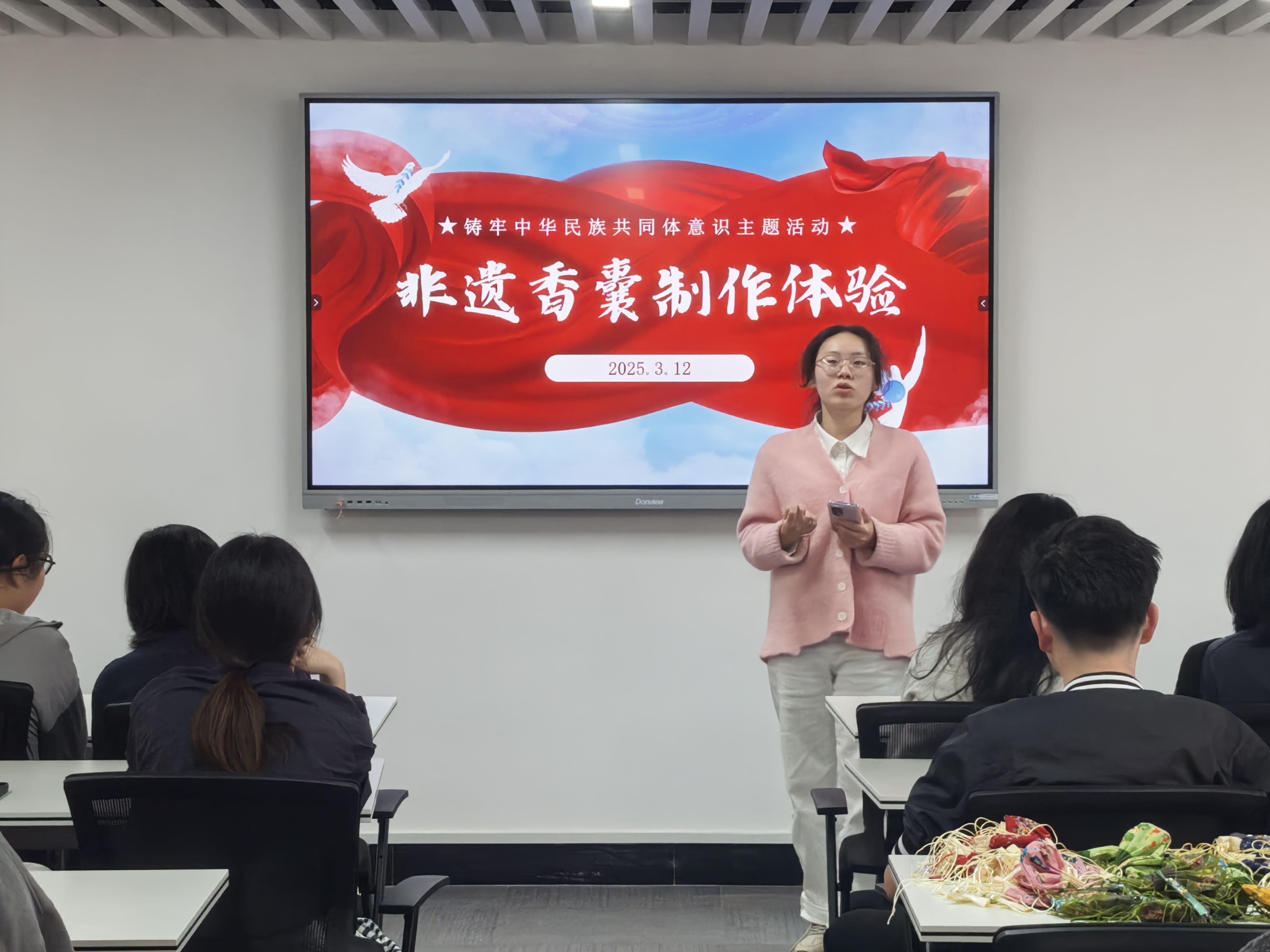 首先,活动负责人郑京晶同学为大家介绍香囊制作技艺的历史渊源、文化背景,以及相关的传统习俗和象征意义,通过播放视频向同学们展示香囊制作的具体步骤和技巧,包括填充香料的份量、如何打结固定以及添加装饰等。