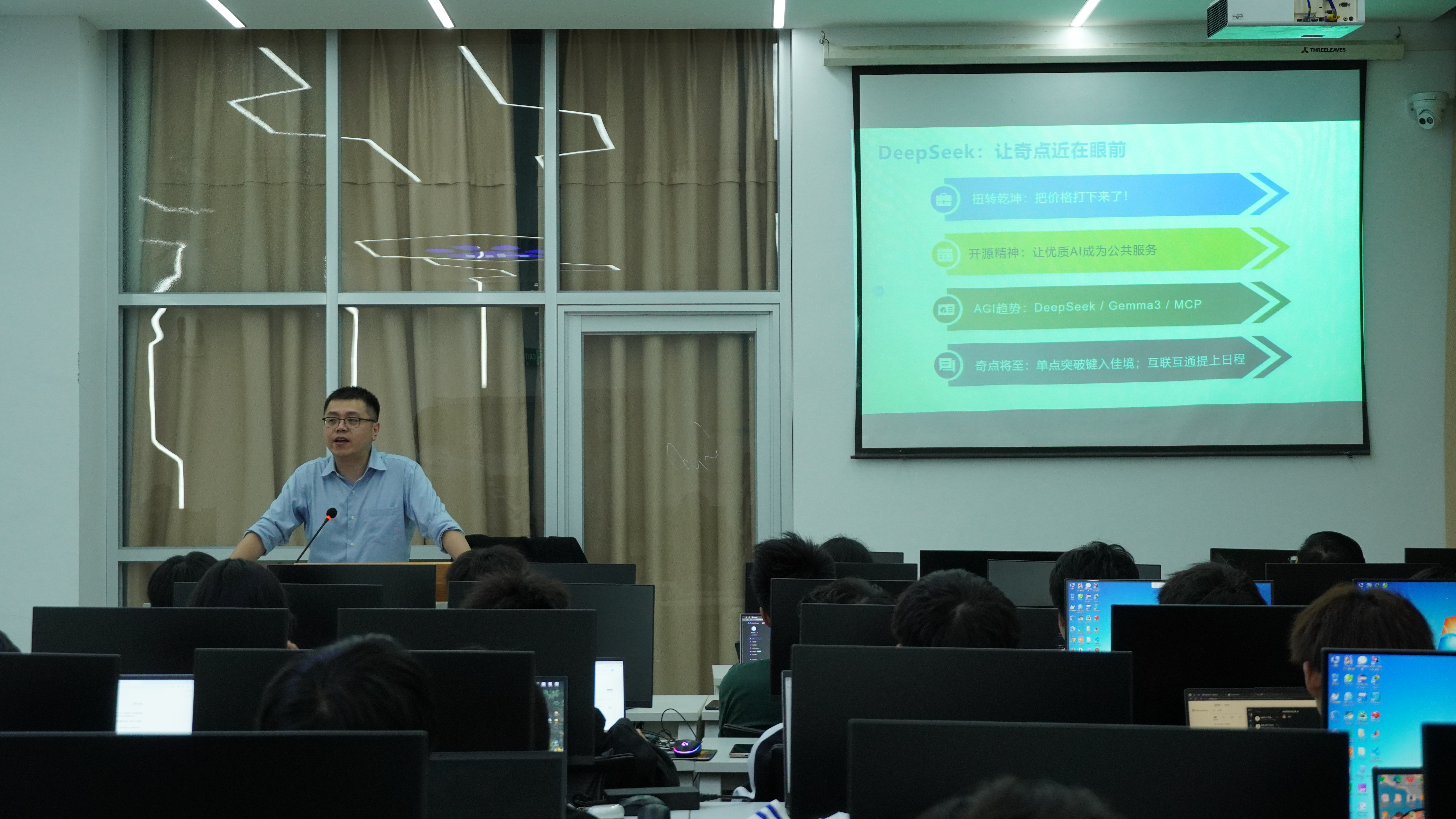 学院党委书记林耿在开课致辞中指出,人工智能以前所未有的速度重塑世界,作为计算机学子,要积极拥抱新技术,增强知识储备,用代码真正发挥人工智能与大模型的优势。希望同学们在课程中提升个人认知和信息素养,学到有助于未来职业发展的技能,真正成为“适应社会需要”的人才。课堂伊始,黄进老师首先分享了大模型发展的三大态势:一是DeepSeek在这波人工智能发展浪潮中引发巨大变革,让几乎所有行业都以其为技术底座,提升了各平台人工智能的表现;二是以Gemma3代表的轻量级多模态大模型,展现出小模型化趋势,能在普通笔记本电脑上运行,为开发者提供了高性能、低门槛的AI工具;三是Mcp协议则有望成为联通大模型和其他功能的关键桥梁,助力AI模型充分释放潜力。随后,黄进老师展示了AI时代背景下的大模型全景图,鼓励同学们紧跟大模型领域的发展趋势,深入探索挖掘技术潜力。