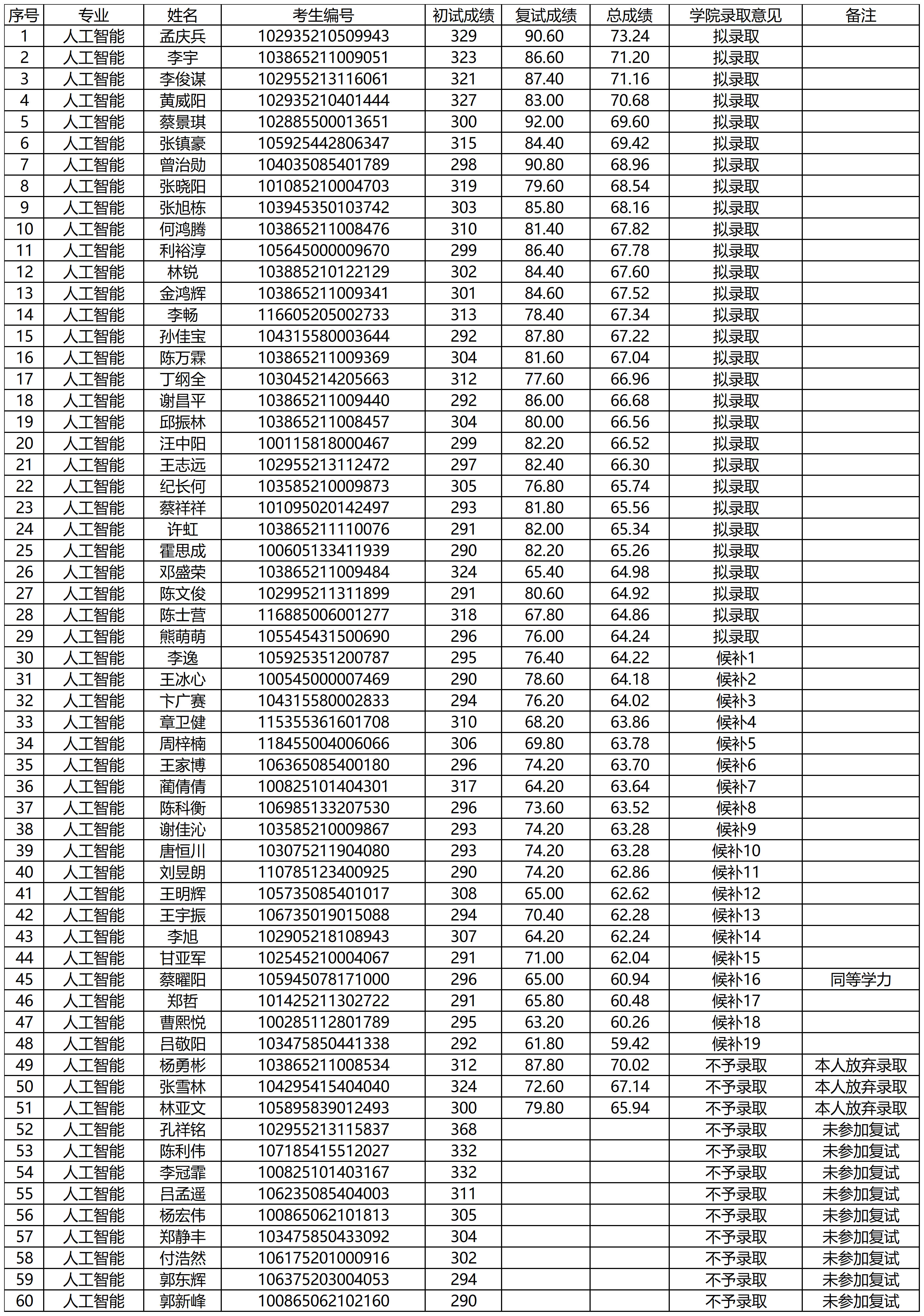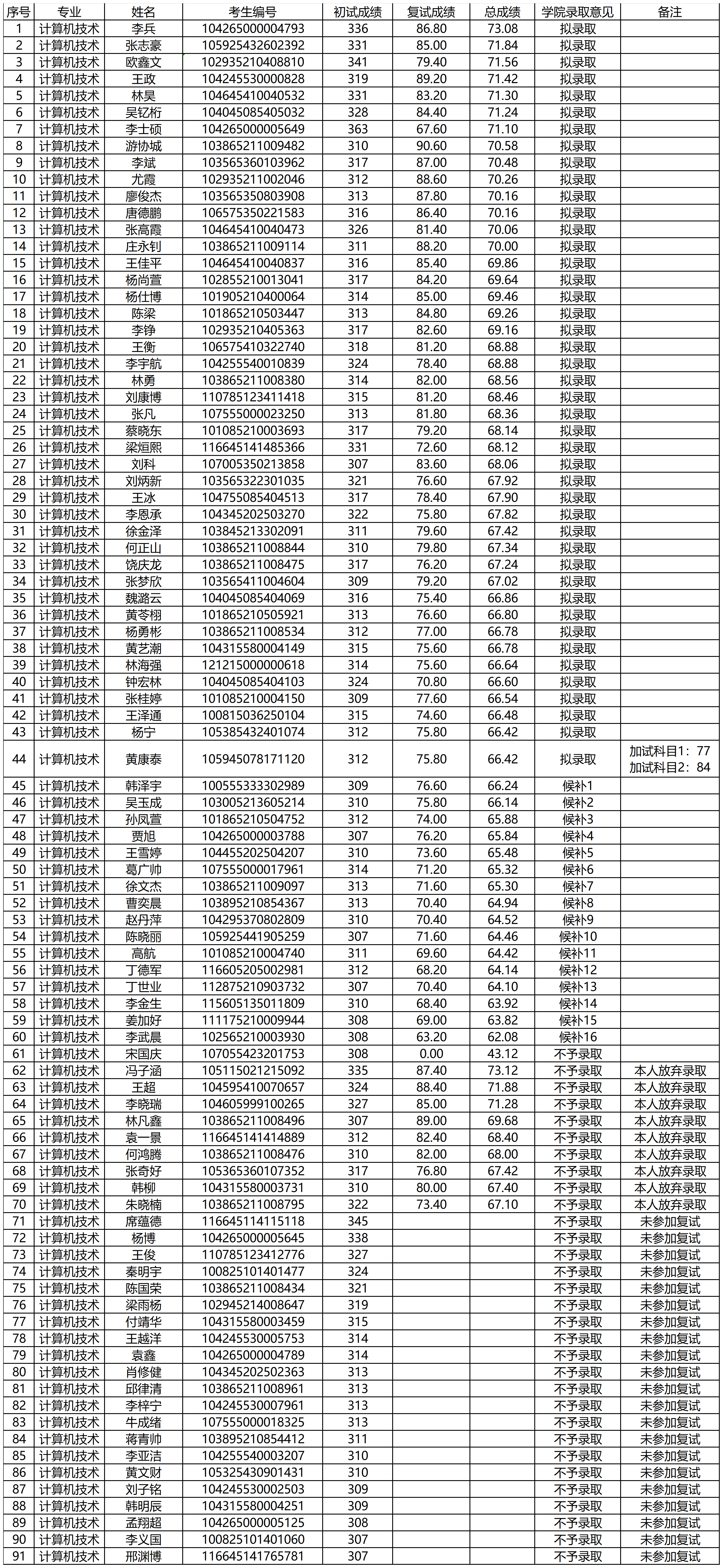 特别说明:“候补”名单为满足计算机与大数据学院招生资格,但复试初试总成绩排名低于此批次招生计划的考生。若有拟录取的考生放弃录取资格或追加招生计划,将按照候补顺序按序补录。因候补录取具有不确定性,因选择等候候补录取名额而导致丧失其它调剂机会的后果,由考生自行负责。