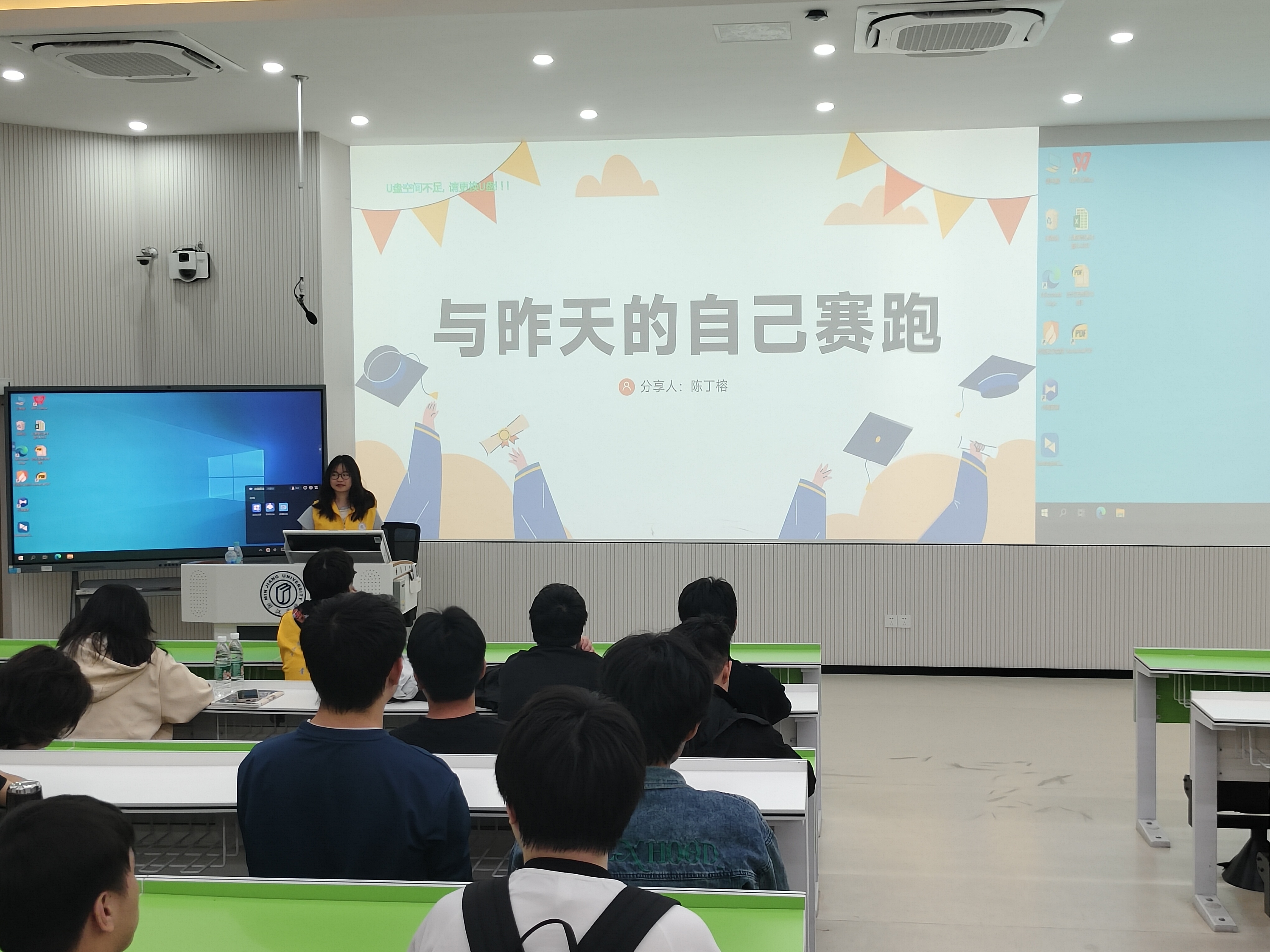 陈丁榕同学,国家奖学金获得者、2022 级通信工程专业学生。她以“超越昨天的自己”为主题,向同学们分享了她从大一的迷茫到大二、大三开始有逐步的目标、有自我追求的个人经历。“学用结合、知行合一”,这是她推荐给在场学弟学妹的学习方式,不再局限于课堂,而是主动参与到学术活动当中。同时,她还讲述到这次分享经历也是她自我激励的过程,能够使她坚定自己的理想信念,更加肯定自己的努力。发现个人的闪光点是极其重要的事,她希望能与同学们共勉,共同营造学院良好的学习氛围。
