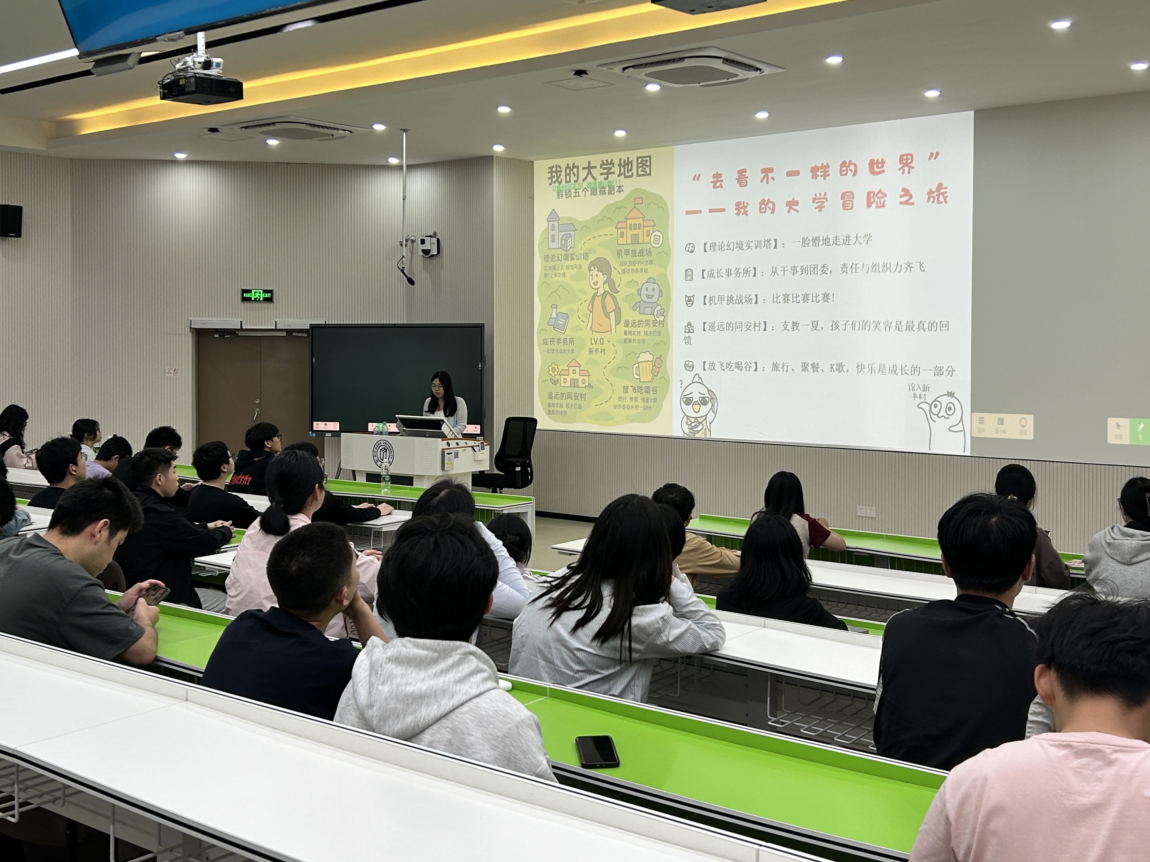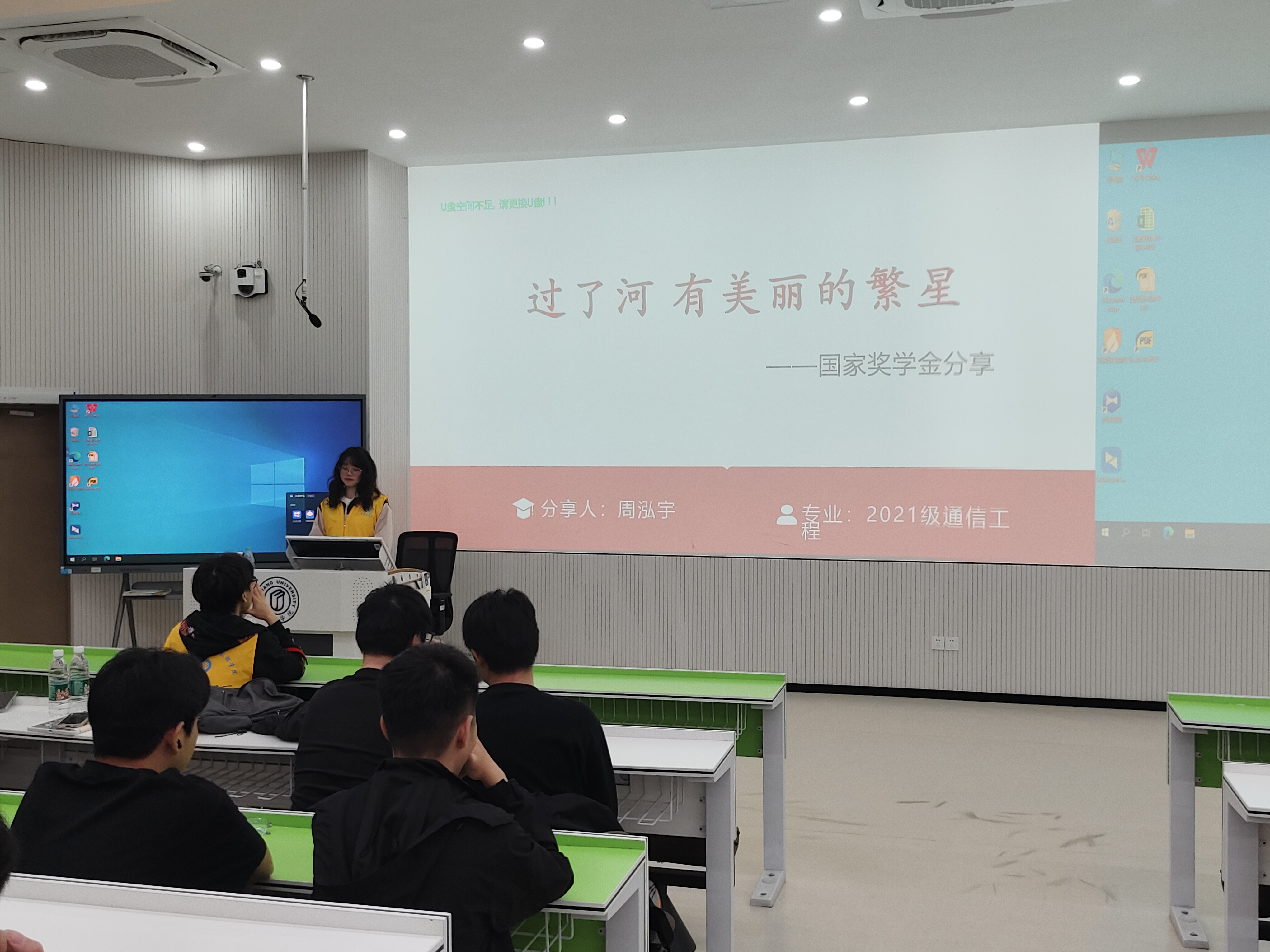 周泓宇同学,国家奖学金获得者、2021 级通信工程专业学生。她以“过了河,有美丽的繁星”为主题,从自己的学业情况、科研竞赛、技能拓展三个方面分享自身经历,告诉大家目标和规划在成长过程中的重要性。在分享过程中她提到:“没人能困住你,除了安于现状的自己”,建议学弟学妹要主动踏出舒适区,去尝试未曾接触过的新鲜事物、学习新的技能、迎接未知的新挑战。她鼓励学弟学妹们,要拥有不怕输的精神,要深知自己肩负的时代使命,奋勇向前,以强大的毅力投身于学习与实践当中,努力创造属于自己的一片天地。