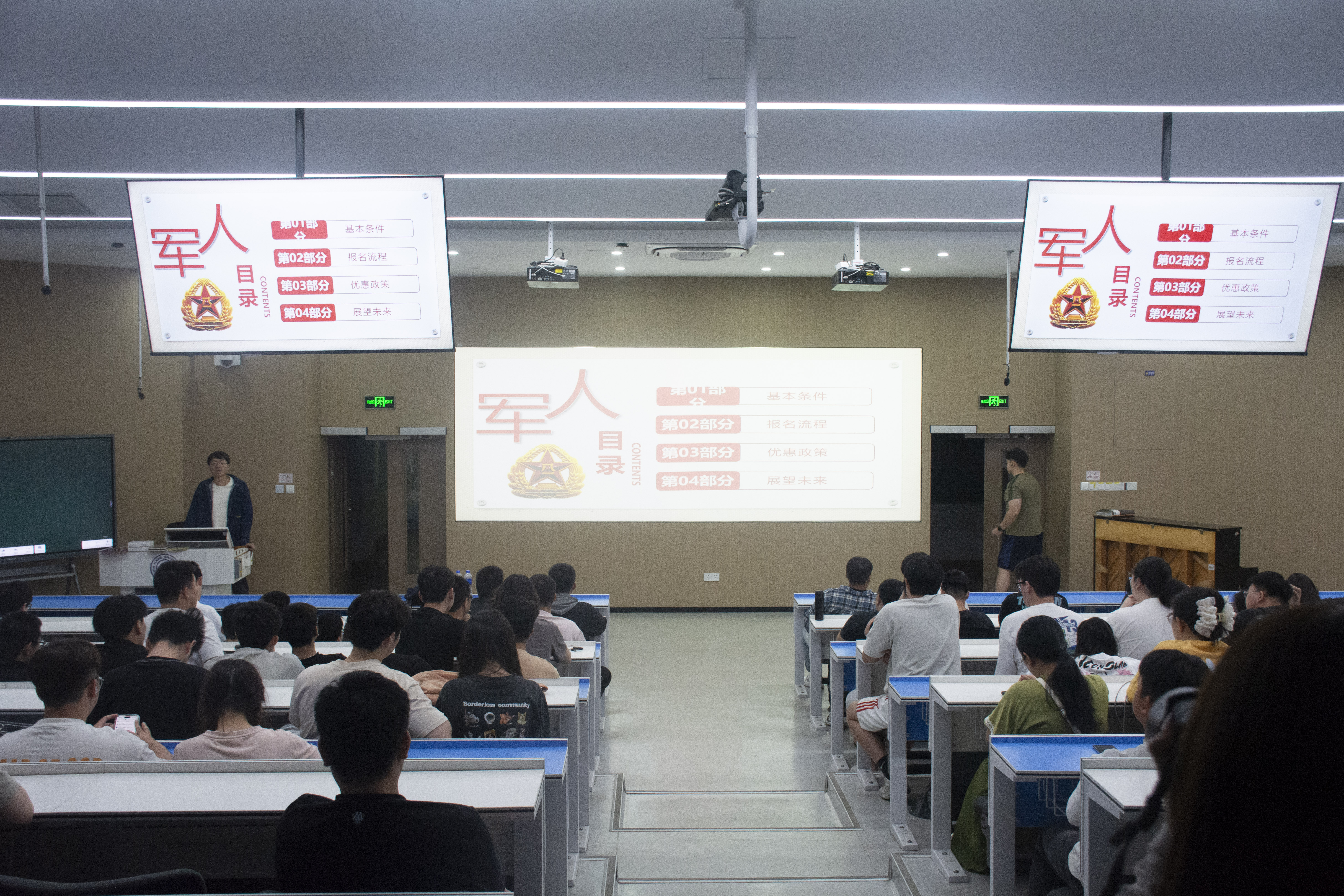 郑轲鹏老师进一步介绍了大学生入伍的优待政策,包括服役期间津贴、退役后复学升学支持及公务员定向招录等。他结合2025年征兵时间节点,鼓励毕业生把握机会,踊跃报名。他指出,参军既是个人成长的 “磨刀石”,更是投身国防建设的 “试金石”,号召同学们以实际行动践行 “国无防不立” 的责任担当。