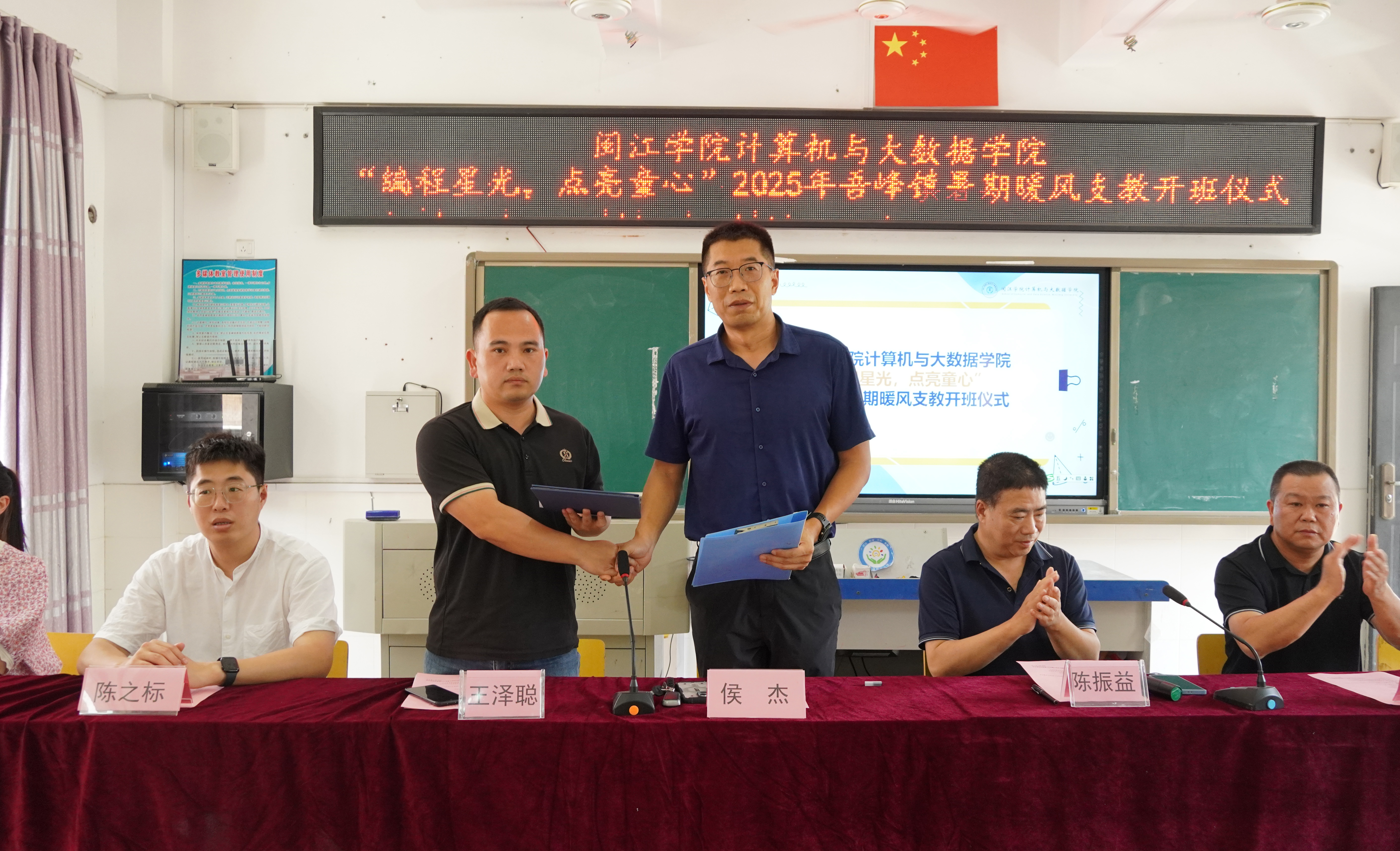 73日下午,计算机学院暖风支教队在永春县吾中小学会议室举行开营暨签约仪式。吾峰镇人民政府武装部部长王泽聪,吾西村委支部书记施星明,吾峰中心小学校长陈振益,吾中小学校长康东海,吾西小学校长刘璐嘉,计算机学院党委副书记侯杰及支教带队辅导员、暖风支教全体队员以及暖风支教班学生、家长代表参加此次开营仪式,仪式由吾中小学校长康东海主持。