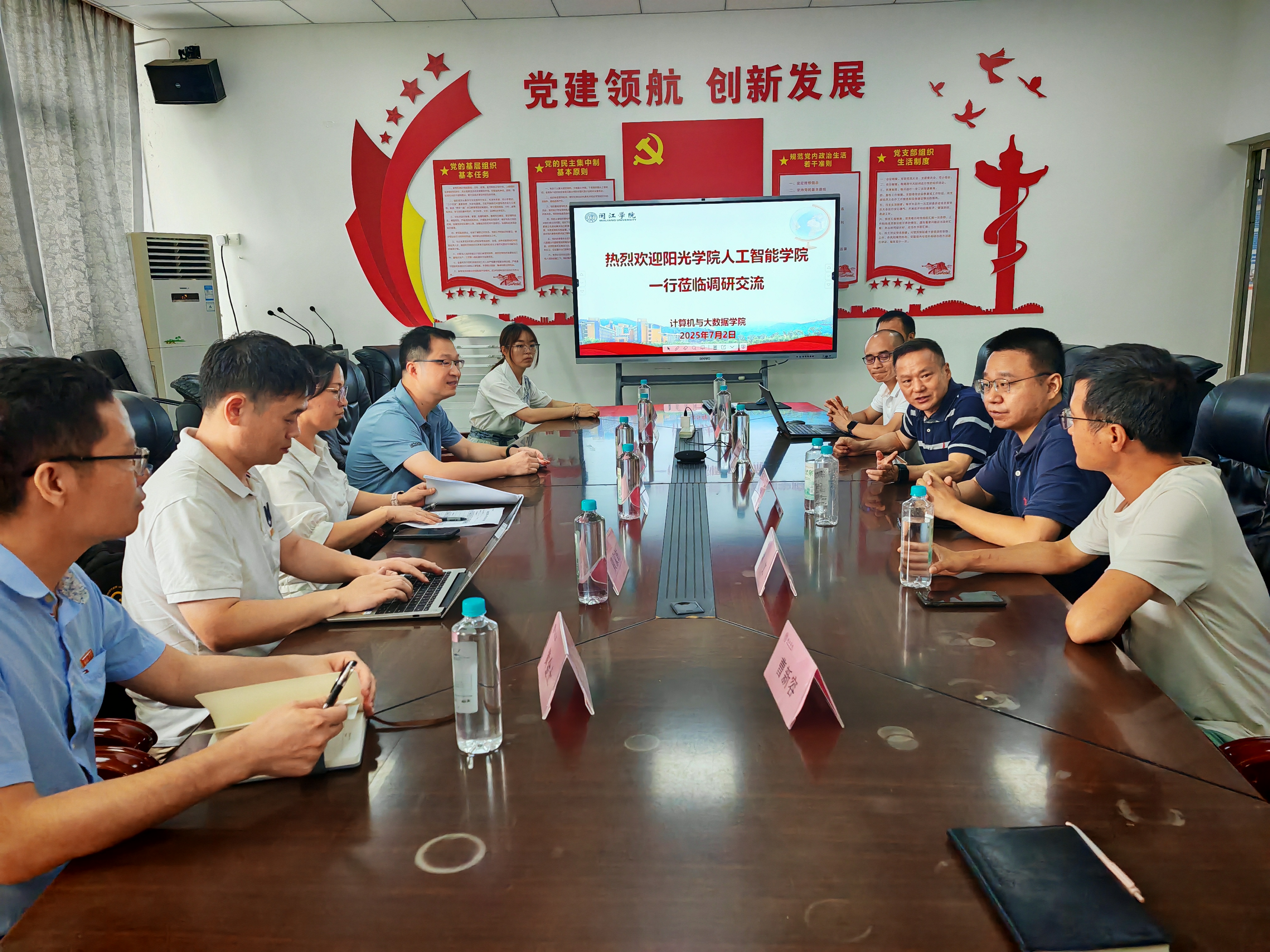 2025年7月2日,阳光学院人工智能学院院长黄风华一行到访av在线 开展专题调研交流。计算机学院院长孙知信主持座谈,副院长徐戈、罗海波,院长助理林文,办公室主任王璟参与座谈,双方围绕新工科建设展开研讨。