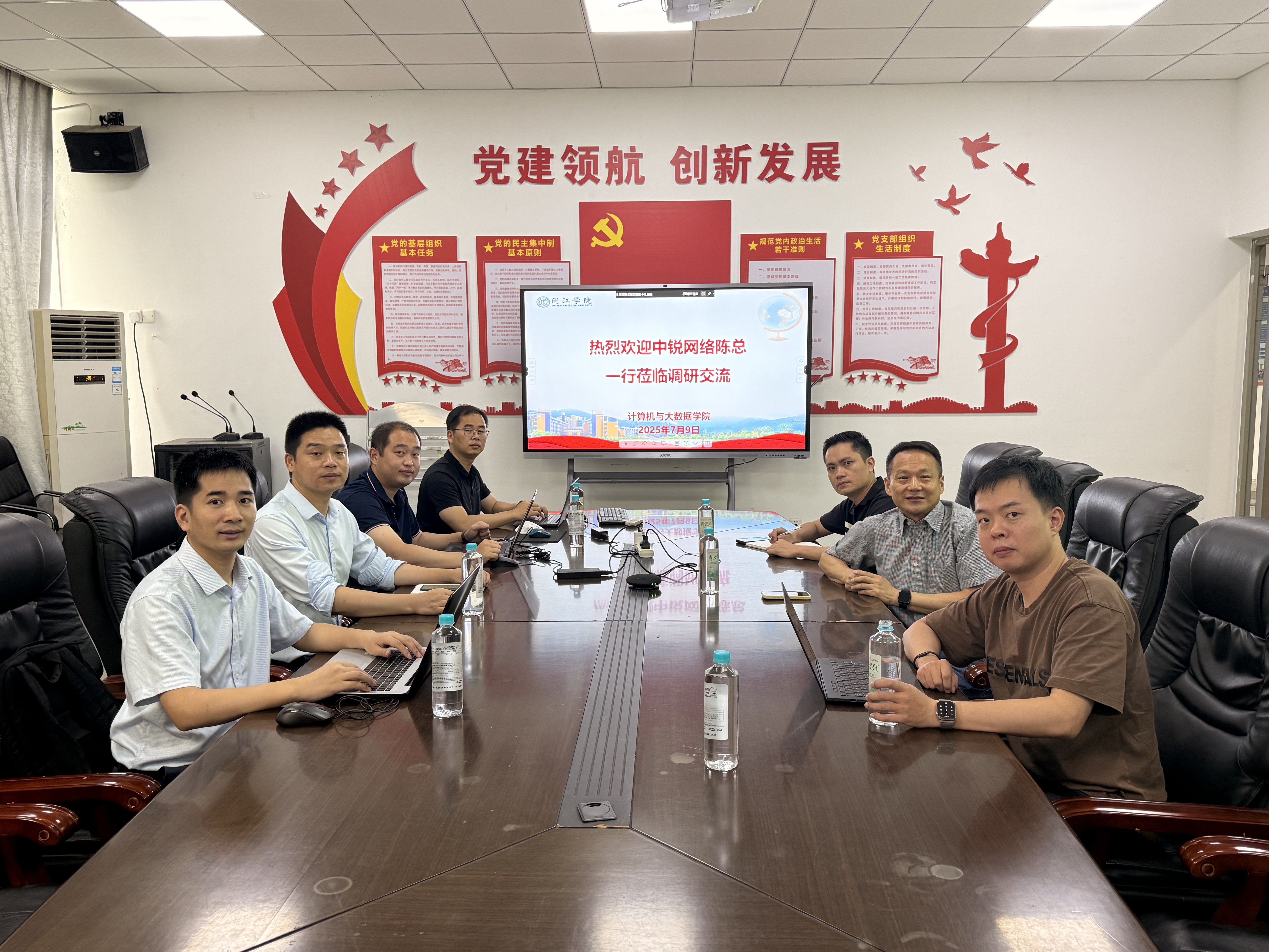 近日,福建中锐网络股份有限公司产品研发中心总监陈友武、副总监李红、技术总监王荣波、教育研发总监胡时进一行来访av在线 ,学院院长孙知信主持接待并主持座谈,侯晨等教师代表参与交流。