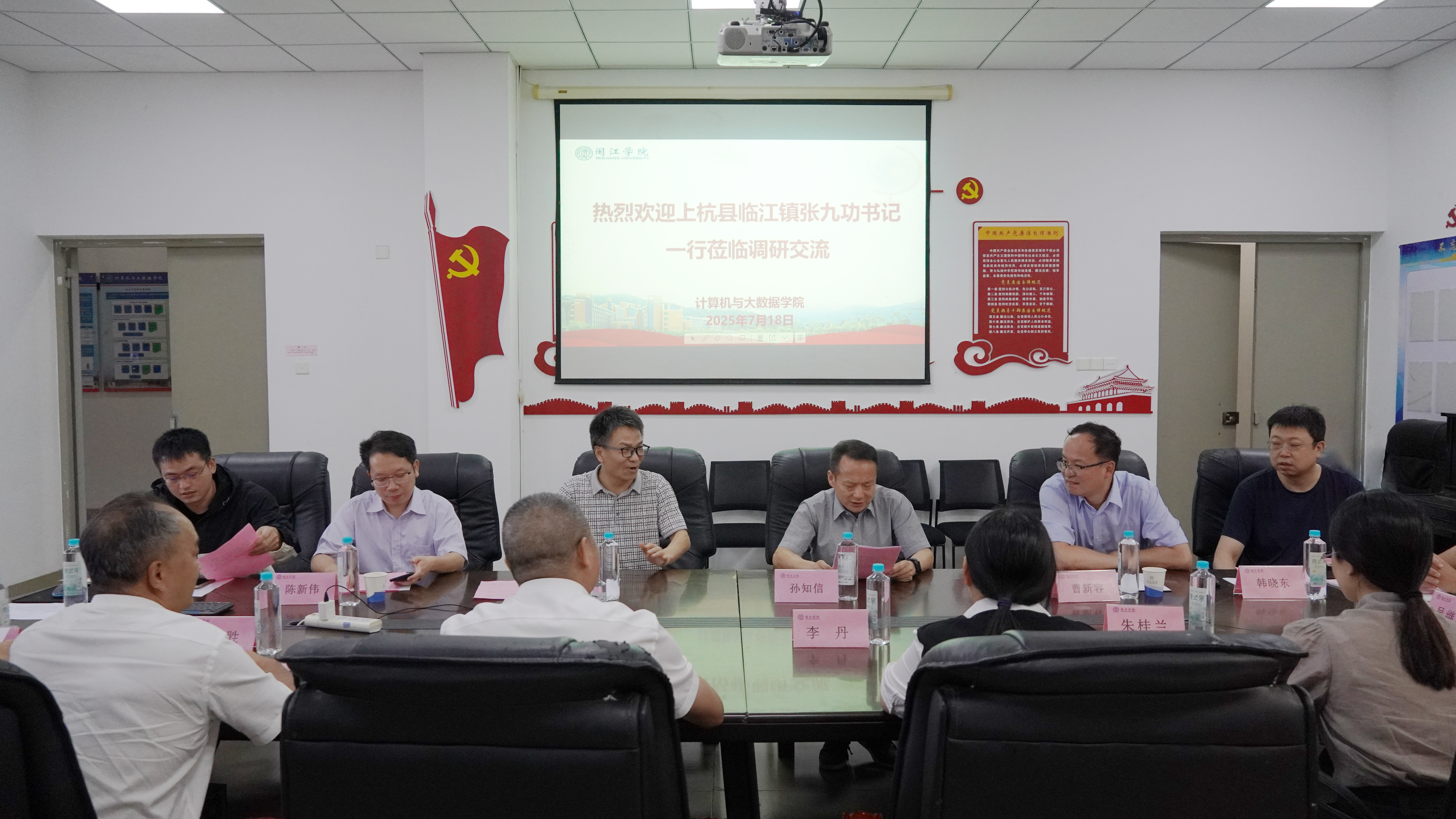 7月18日下午,上杭县临江镇党委书记张九功率队访问av在线 ,av在线 科研处处长姚俊峰、计算机学院院长孙知信携学院骨干教师团队热情接待并举行座谈。