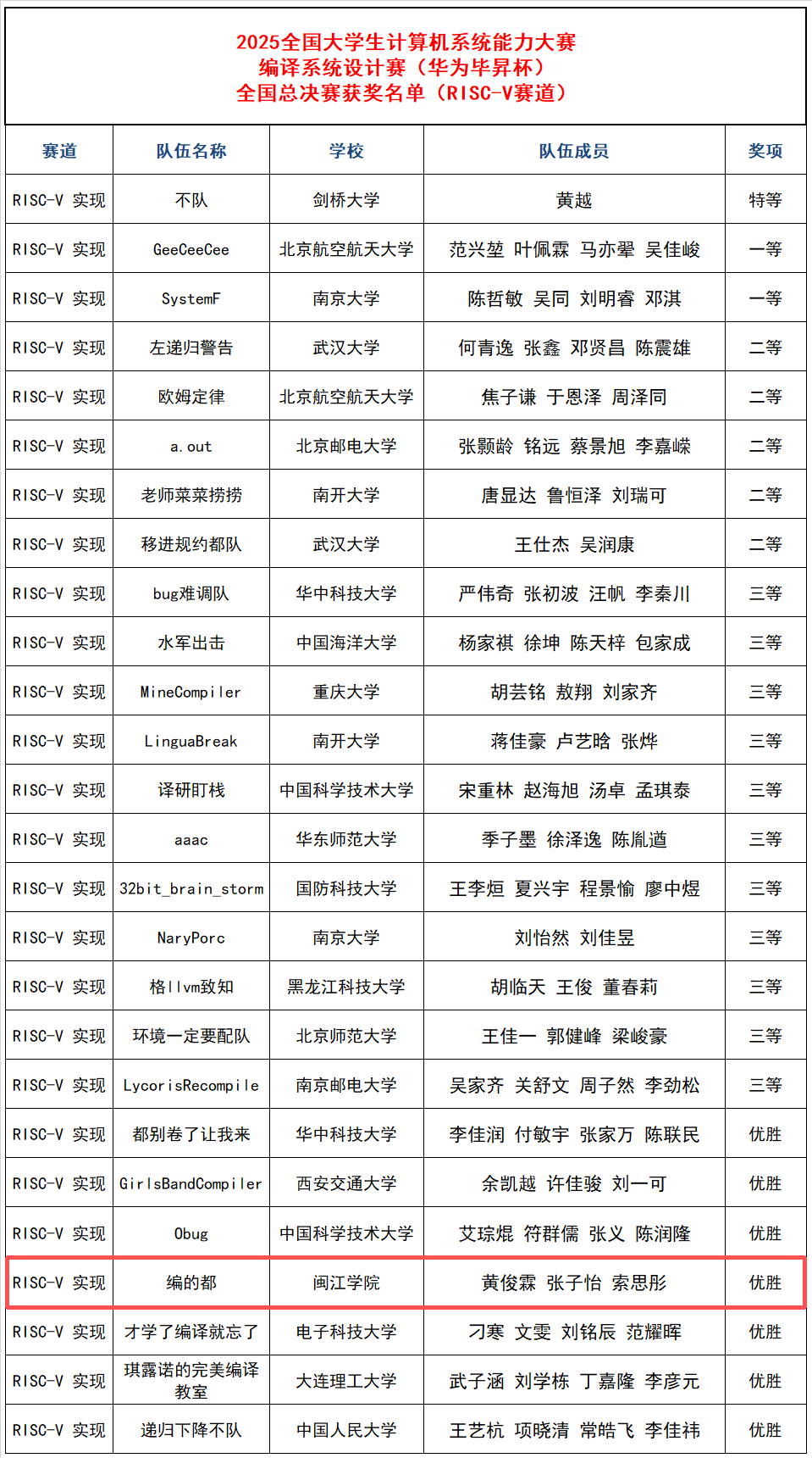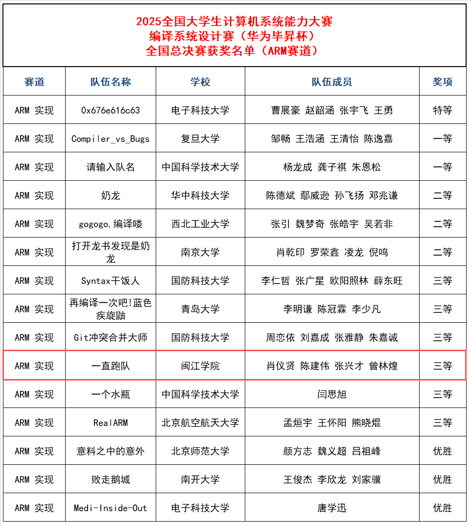 附件:2025年全国大学生计算机系统能力大赛编译系统设计赛(华为毕昇杯)全国总决赛获奖名单