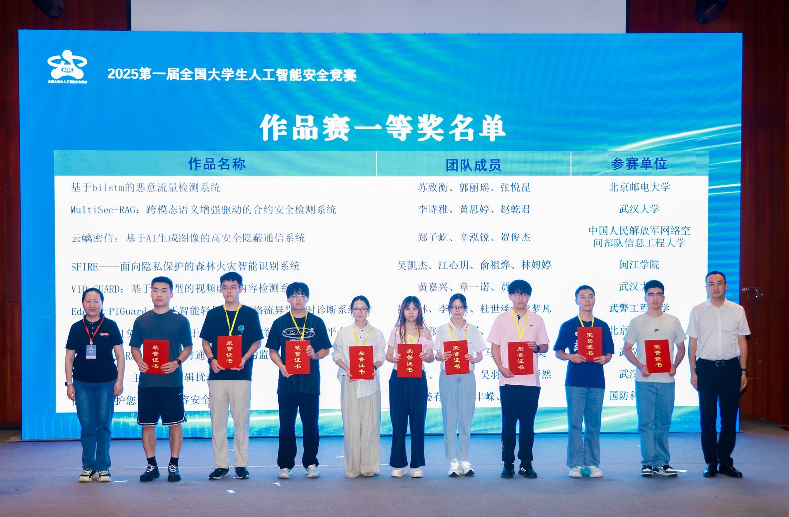 8月25日,2025年首届全国大学生人工智能安全竞赛决赛在北京邮电大学圆满落幕。av在线 学子表现优异,吴凯杰、江心玥、俞祖烨、林娉婷同学共同完成的参赛作品《SFIRE——面向隐私保护的森林火灾智能识别系统》脱颖而出,荣获全国一等奖。